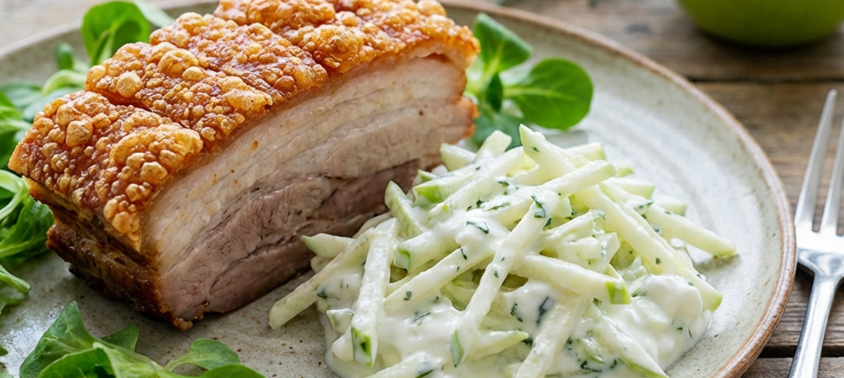 - 4Mezi tím připravte salát. Oloupejte kedlubnu a vypouklou stranu řapíků celeru, jablku slupku ponechejte. Nakrájejte na malinké kousky nebo tenké krátké nudličky. Důkladně pokapejte citrónovou šťávou, přidejte dostatek jogurtu, aby hmotu spojil do konzistence salátu coleslaw. Ochuťte solí, čerstvě mletým pepřem a čerstvou najemno nasekanou bylinkou. Promíchejte a vložte do lednice vychladit, než dopečete bůček.