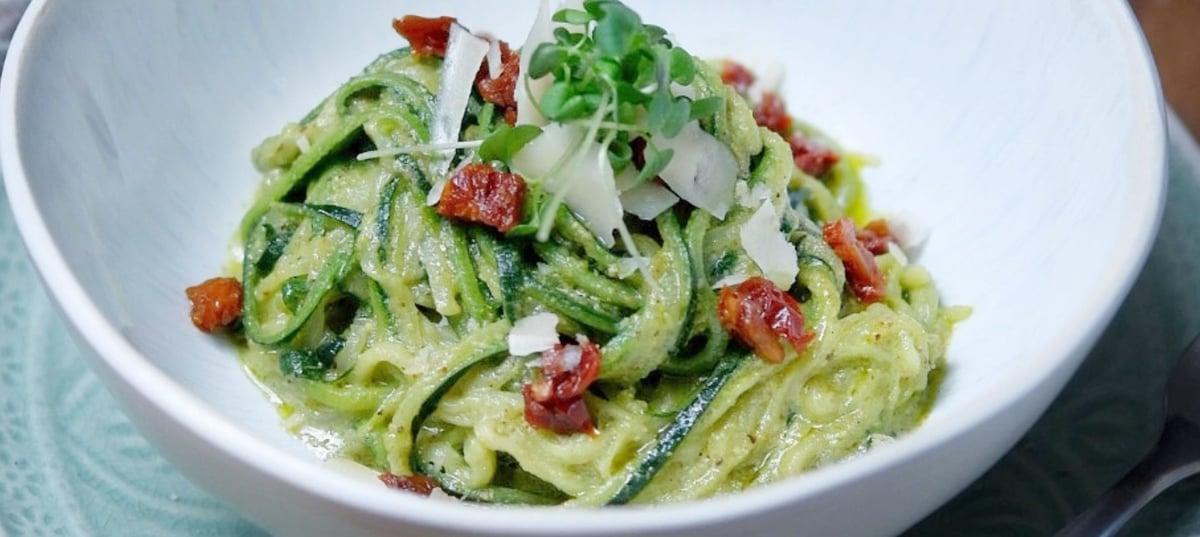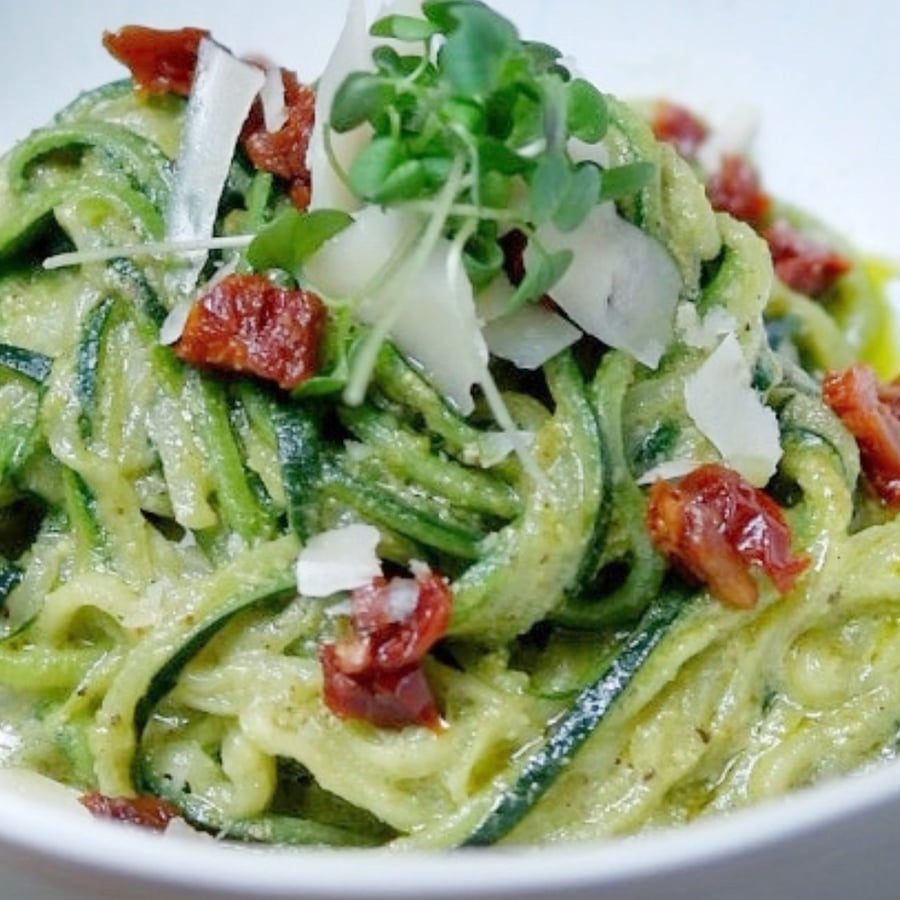 - 3Heat 1 tablespoon of olive oil in a pan, add sliced garlic and let it turn golden, then add the zucchini and sauté for a few minutes until the zucchini softens. Carefully stir in the pesto, sun-dried tomatoes, and season with pepper.