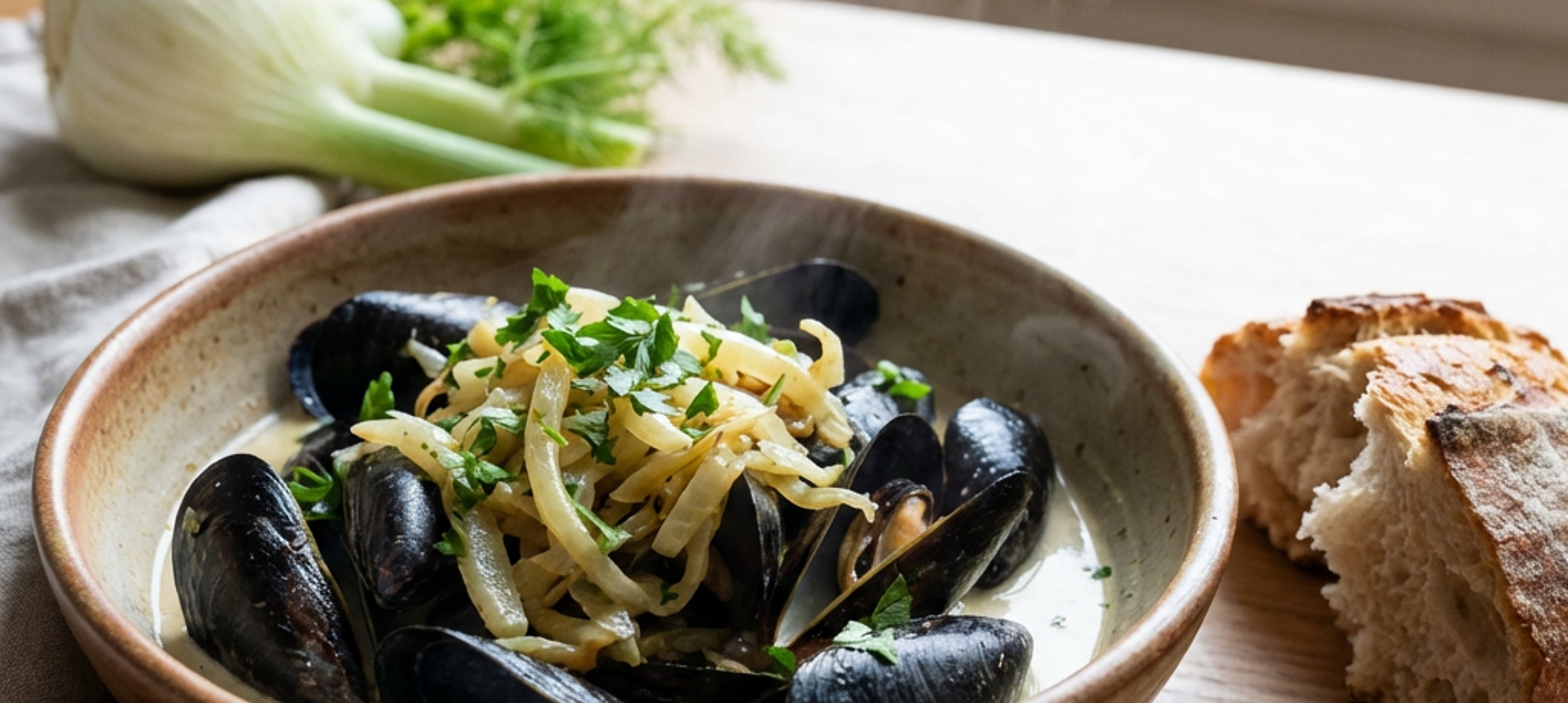 - 3V kastrolu na vyšším ohni rozehřejeme máslo a necháme na něm zpěnit cibuli a fenykl. Osolíme, přidáme slávky a zakryjeme poklicí. Po 1,5 minutě přilijeme smetanu a 200 ml vody. Zakryjeme poklicí a necháme dusit další 3,5 minuty.