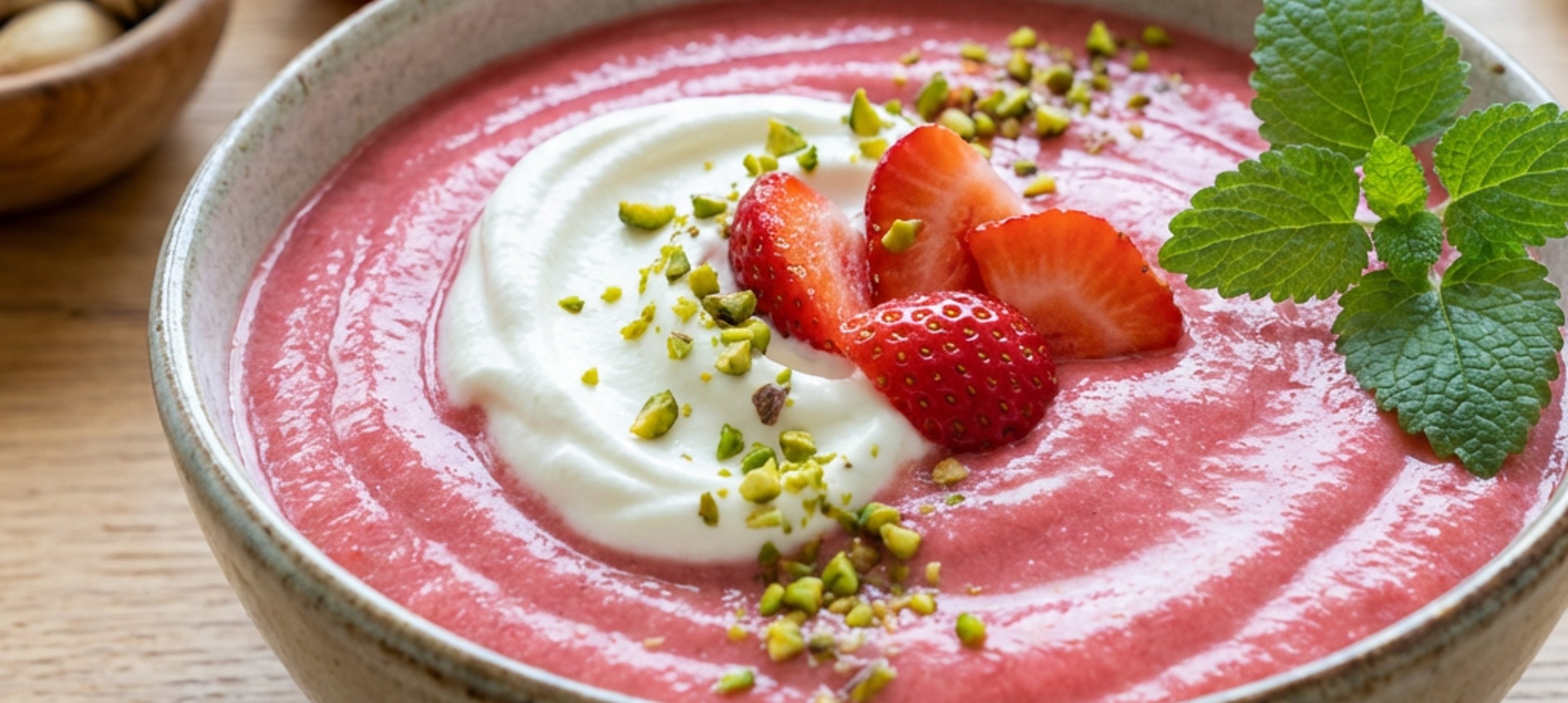 - 3Rozmixovaný krém nalijte do talířů a ozdobte smetanou, jahodami, popřípadě i nasekanými pistáciemi a lístky meduňky.