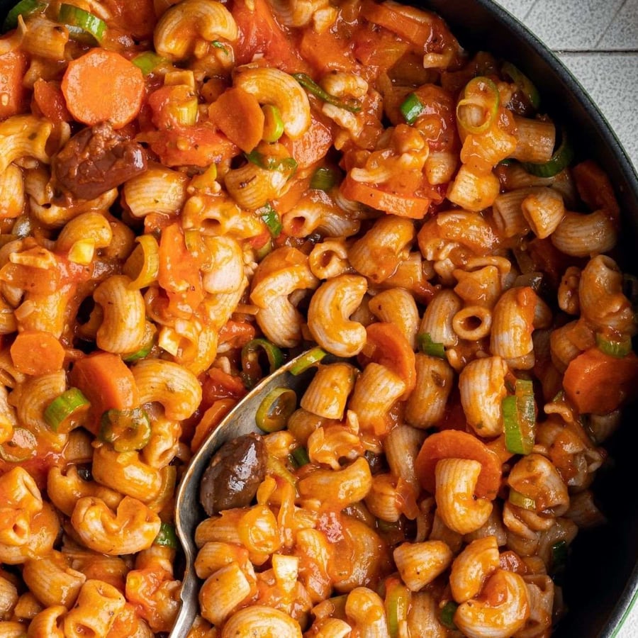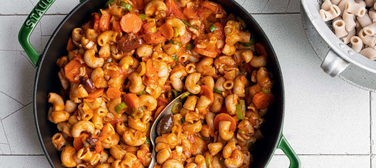 - 5When the carrots are soft, turn off the heat, add the cooked pasta, butter, and spring onion greens, season with oregano, salt, and pepper, mix well, divide into individual portions, and serve.