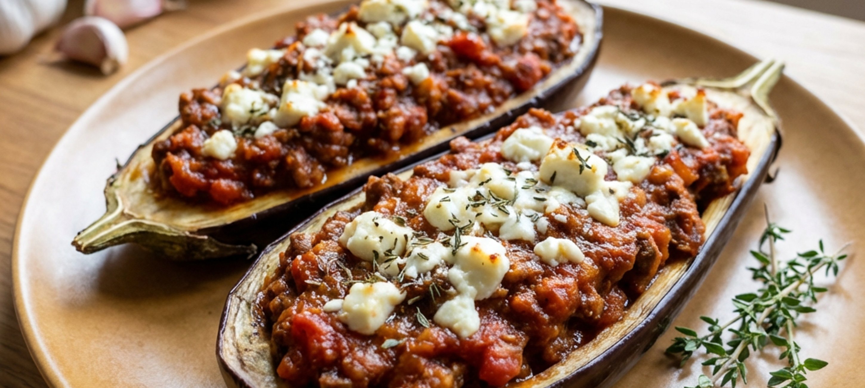 - 3Mezitím co se vaří náplň, si předehřejte troubu na 170 °C, připravte si plech a vyložte jej pečicím papírem. Na plech dejte lilky rozkrojenou stranou dolů, pomažte je olivovým olejem, dejte do vyhřáté trouby a pečte 10–15 minut na 170 °C. Poté plech vyndejte a připravte si masovou směs, která by už měla být hotová. Lilky otočte, lžící je směsí naplňte a pečte 25 minut na 165–170 °C. Následně na lilky prsty rozdrobte sýr feta a pečte dalších 5–8 minut na 165–170 °C, než se sýr roztaví.