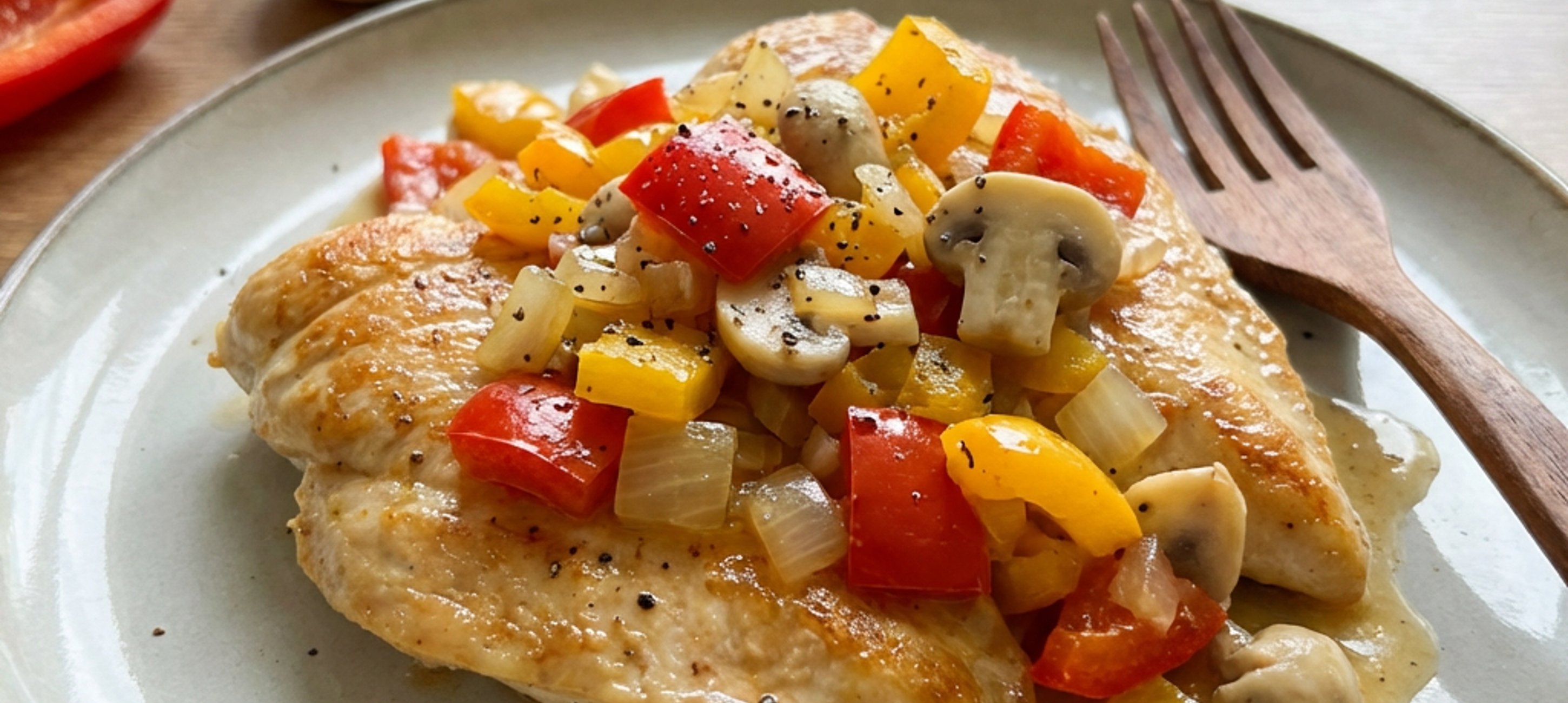 - 1Nejprve si očistěte papriky, cibuli a žampiony a nakrájejte je na malé kostičky (cca 1 cm × 1 cm). Kuřecí prsa očistěte od blan, osolte a opepřete.
