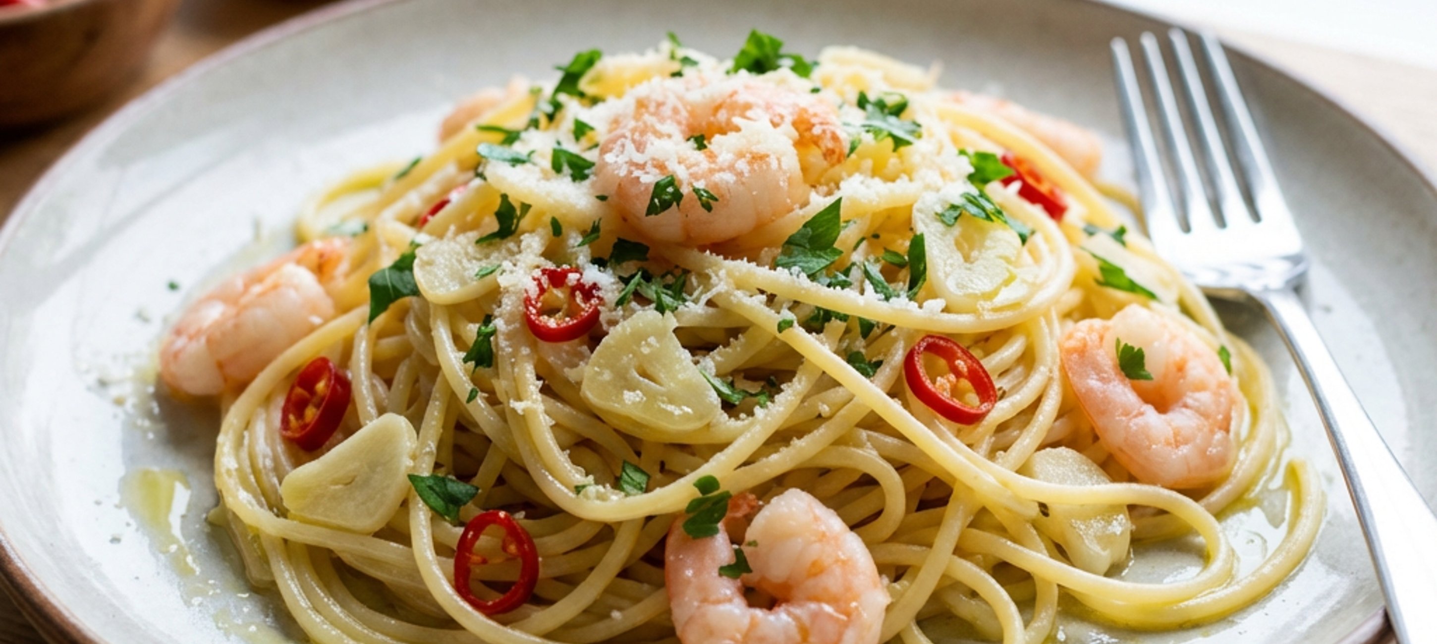 - 4Olivový olej vlijeme do studené pánve, přidáme česnek a chilli papričku a pánev zahřejeme na střední teplotu. Za častého míchání restujeme 4 minuty. Přilijeme 100 ml vody ze špaget a zahříváme další 4 minuty.