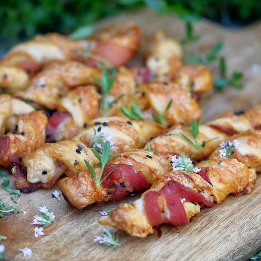 - 4Cut each slice of bacon lengthwise in half. Place bacon on each strip, fold the dough strip with bacon so that the brushed part with bacon is on the outside.
