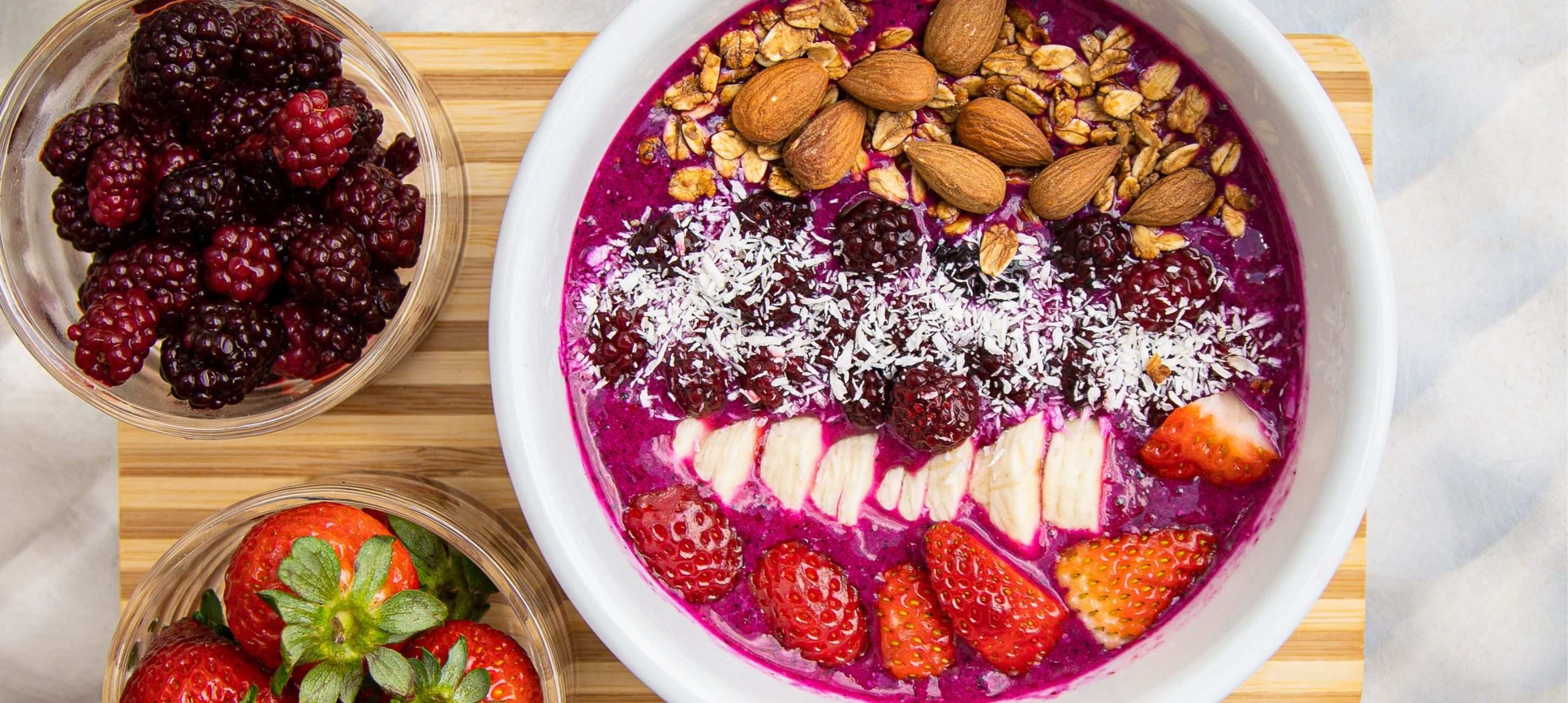 - 3Pour the smoothie into a bowl and garnish with fruit, chia seeds, shredded coconut, and almonds.