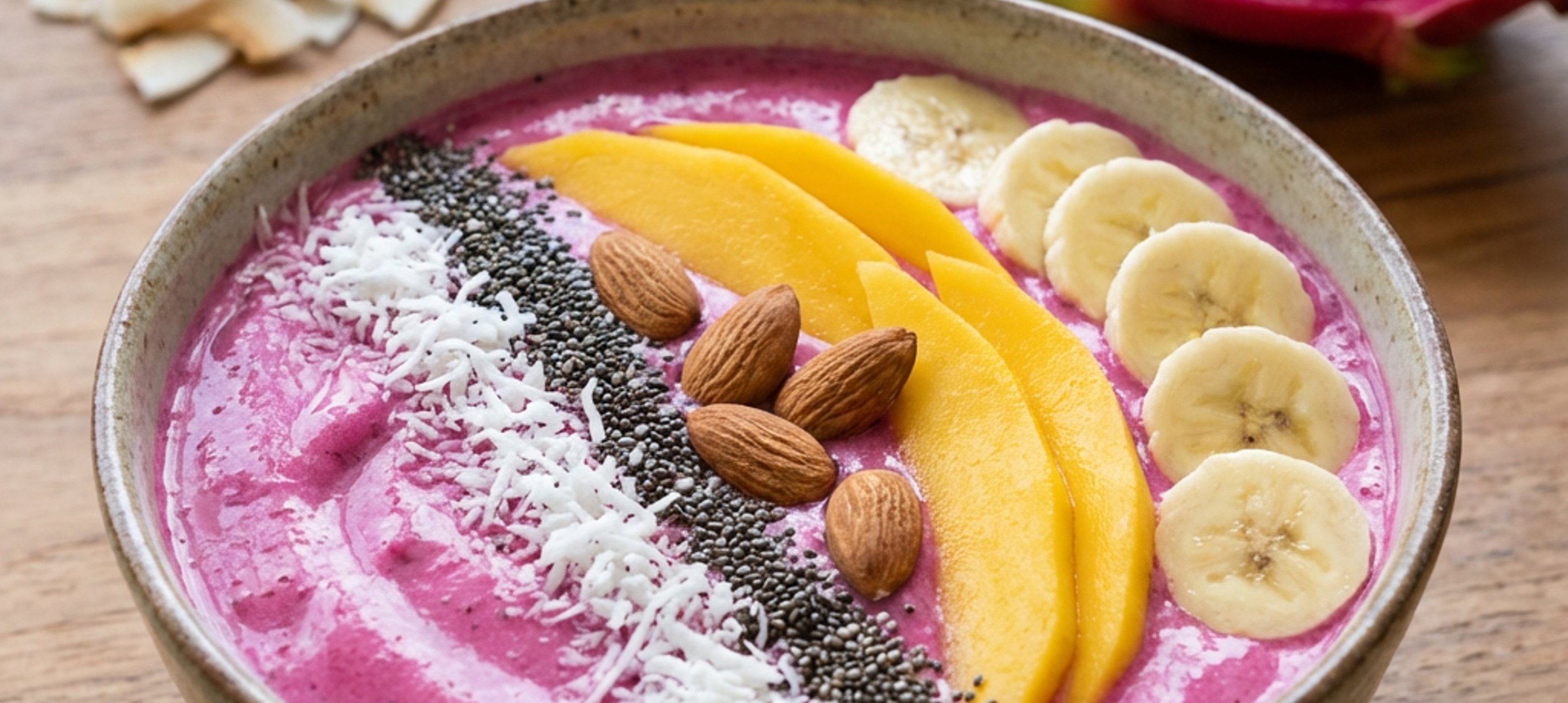 - 3Smoothie nalijte do misky a ozdobte ovocem, chia semínky, strouhaný kokos a mandle.