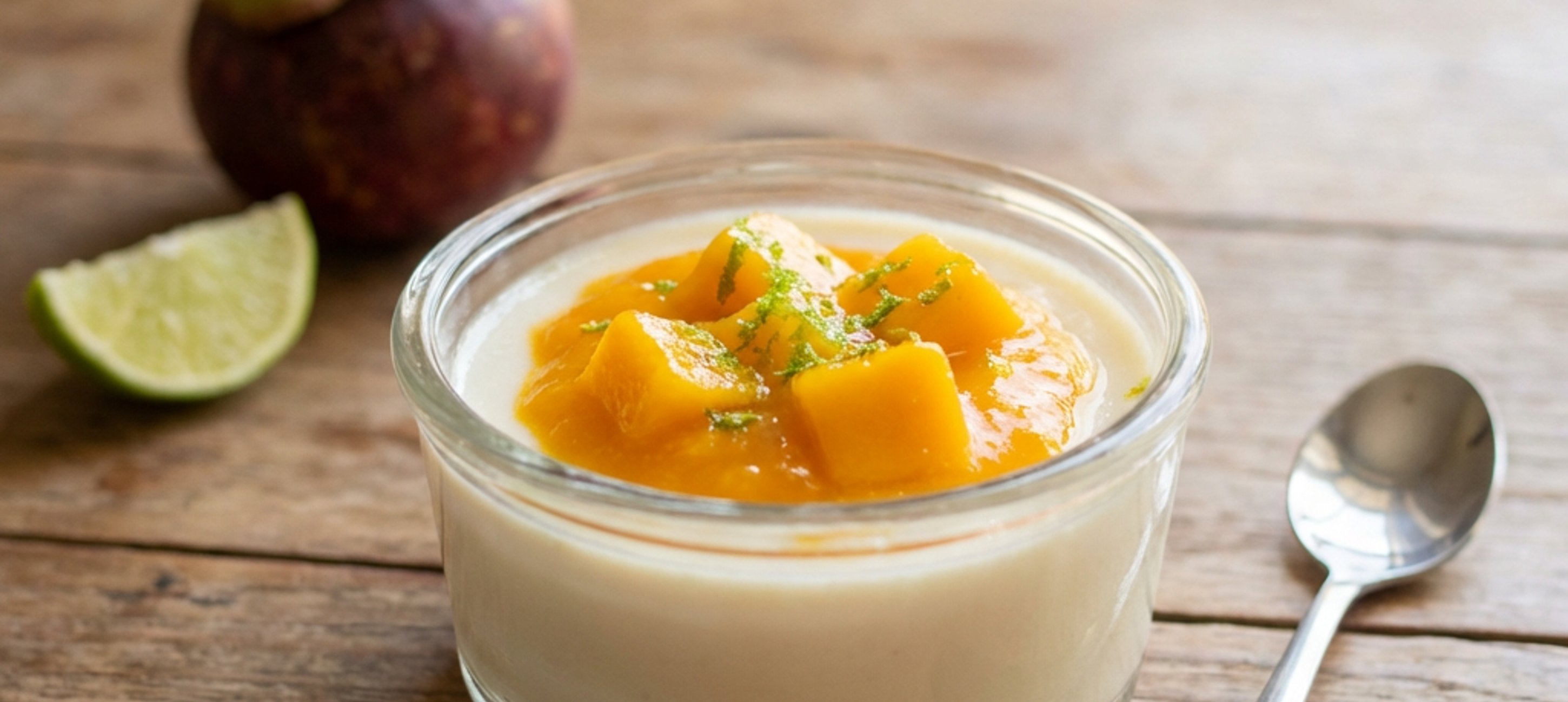 - 7Mangovou směs rozdělte do mističek s Panna cottou.