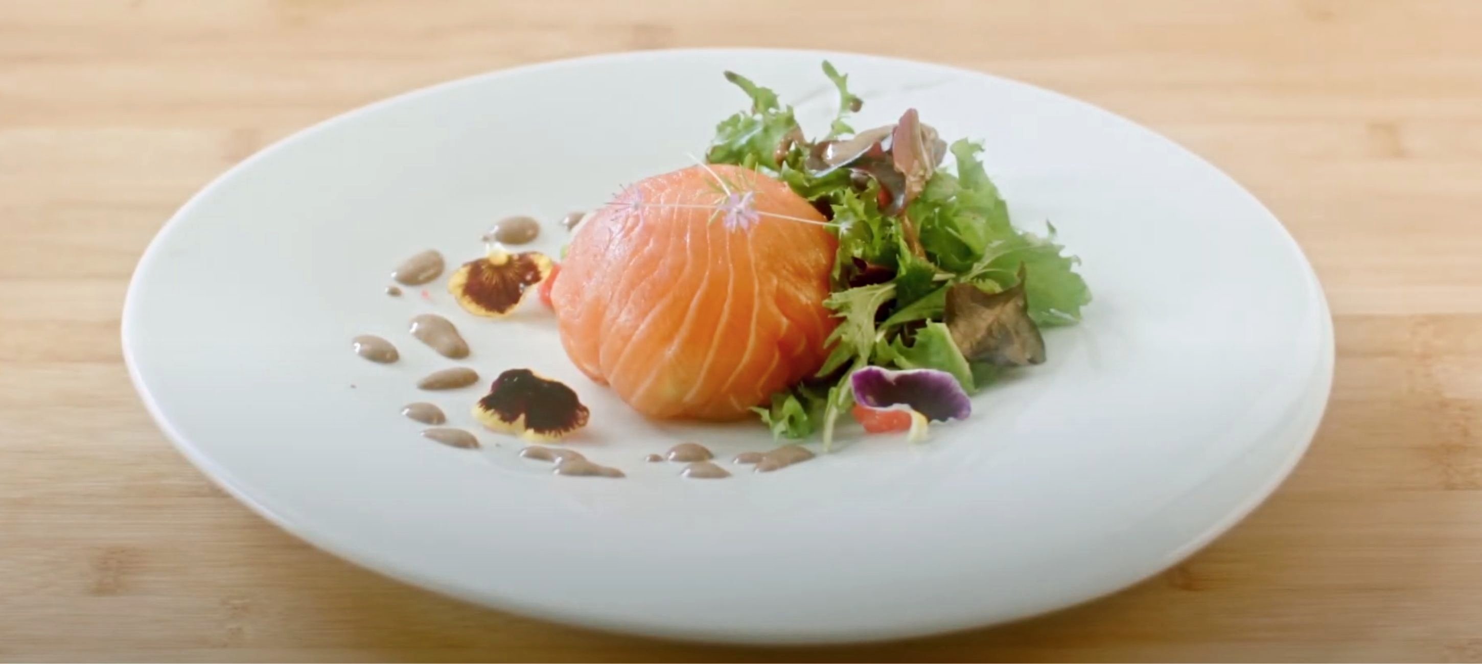 - 6Place a mix of green salads on a plate, add the salmon ball, season with the dressing, and serve.