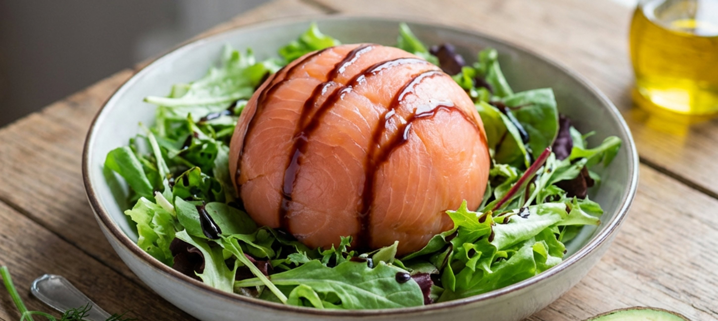 - 6Na talíř umístěte mix zelených salátů, lososovou kouli a dochuťte zálivkou a můžete podávat.