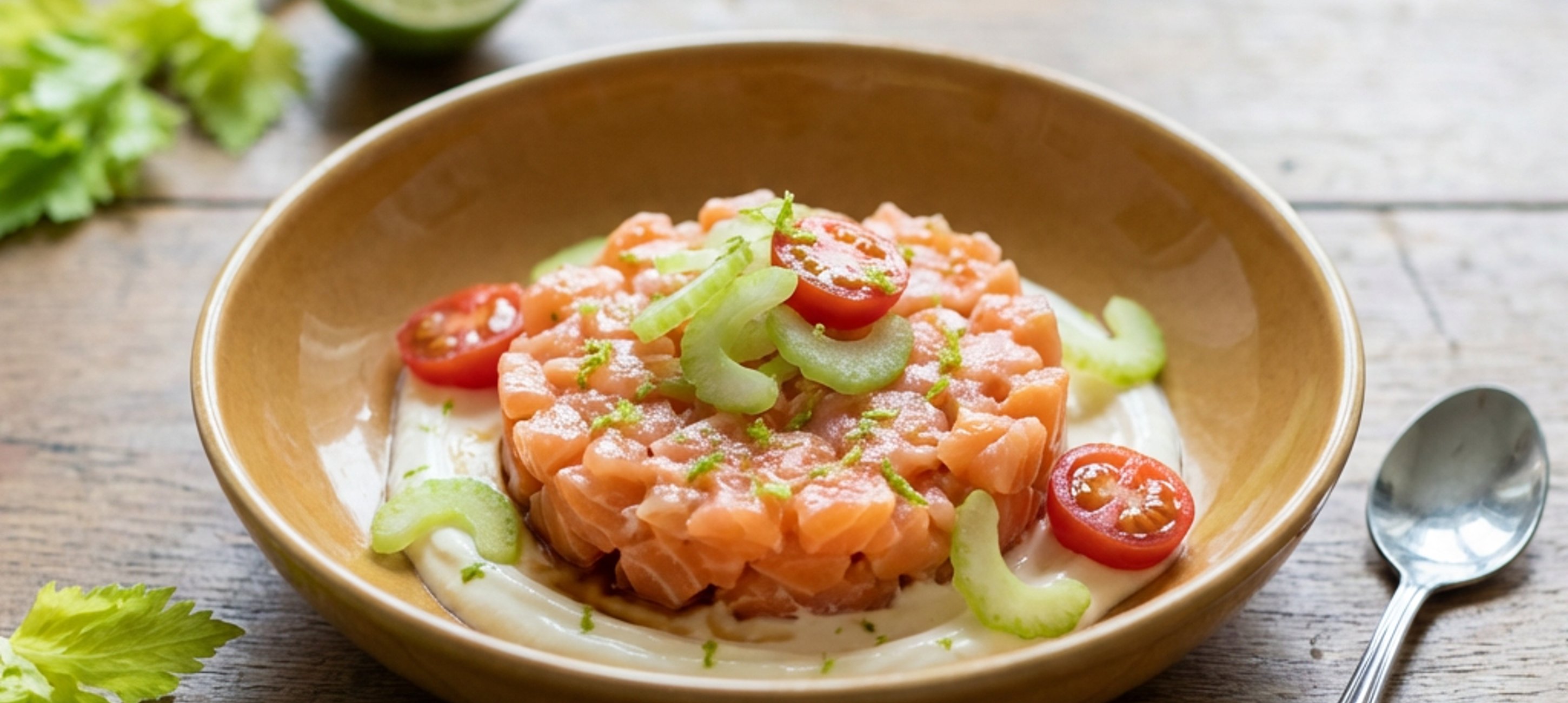 - 3Navrch dejte lososa a ozdobte kůrou z limety.