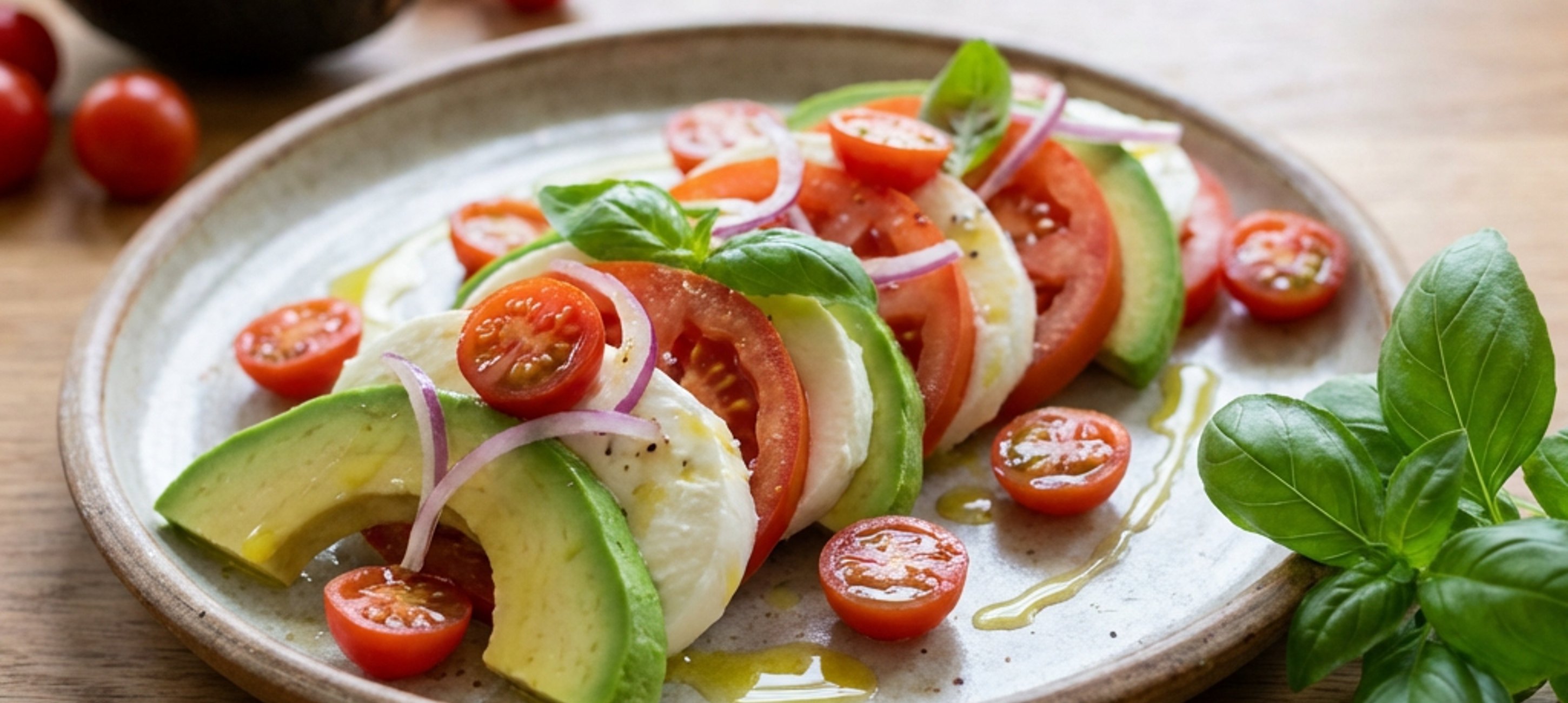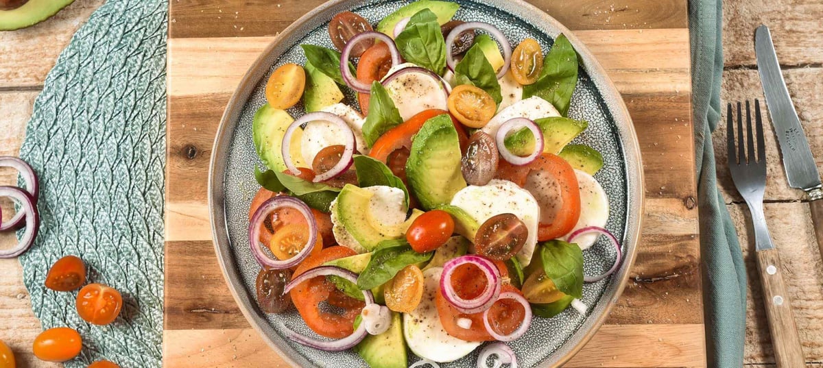 - 3Pokládejte plátky mozzarelly, avokáda a rajčat střídavě na talíř tak, aby se částečně překrývaly jako střešní tašky. Na povrch pokládejte cherry rajčata a cibuli. Podle chuti osolte a opepřete.