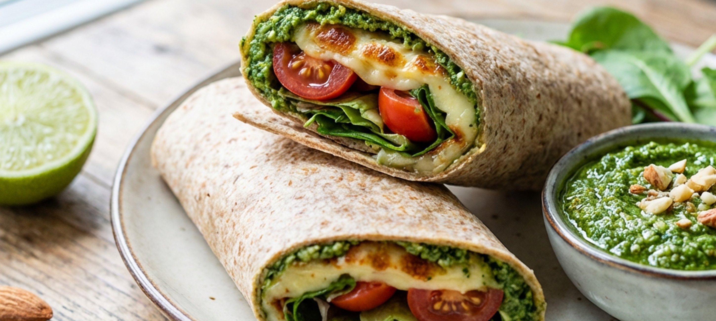 - 4Tortilly pomažte pestem, položte na něj mix salátů a rajčátka a nakonec položte ogrilovaný sýr.