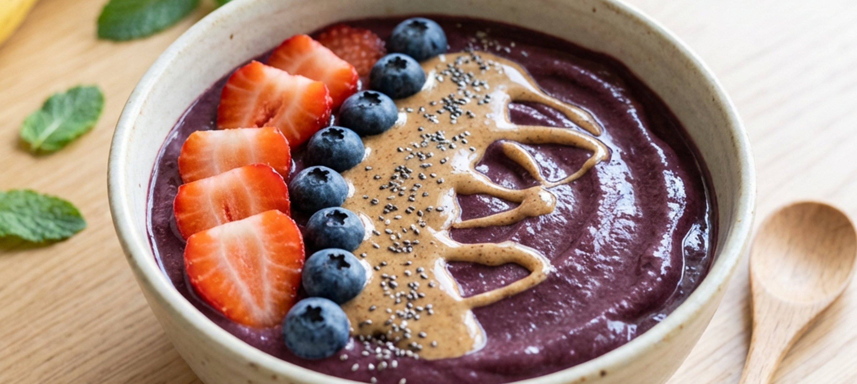 - 2Rozdělíme do dvou misek, ozdobíme ovocem, chia semínky a mandlovým máslem.