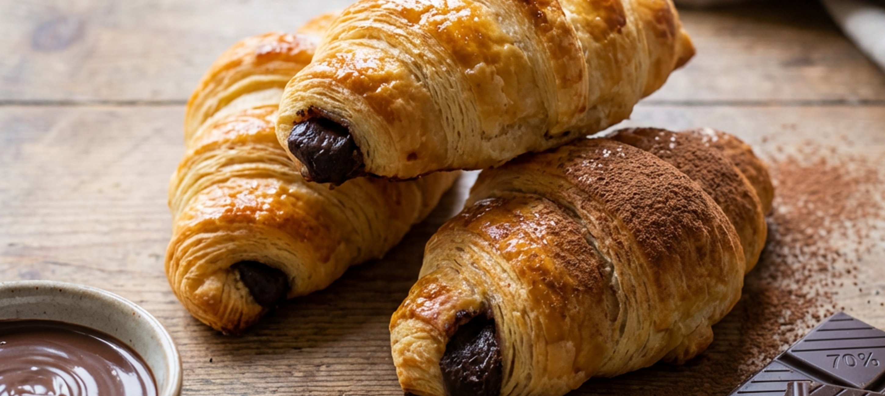 - 3Trojúhelníkové pláty potřete čokoládovou směsí a opatrně zabalte od širšího kraje k cípu.