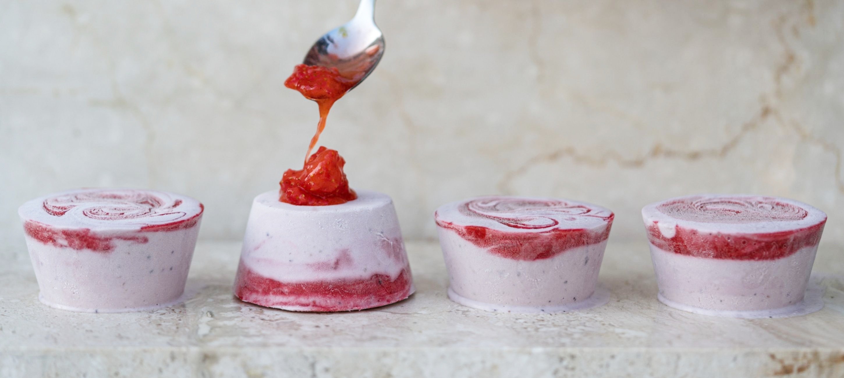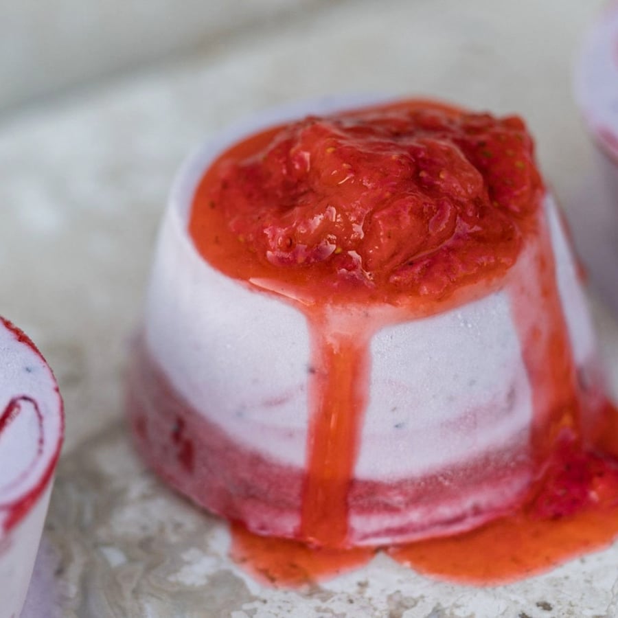 - 3If you have an ice cream maker, use it to chill the mixture. If not, no worries. Pour into a sealable container and freeze. After about an hour of freezing, prepare the strawberry pulp. Blend the strawberries, mix in the vanilla sugar and gin, and for a marbling effect, spoon islands of the strawberry mixture into the ice cream base. You can further swirl the islands with a skewer in circular motions over the ice cream.