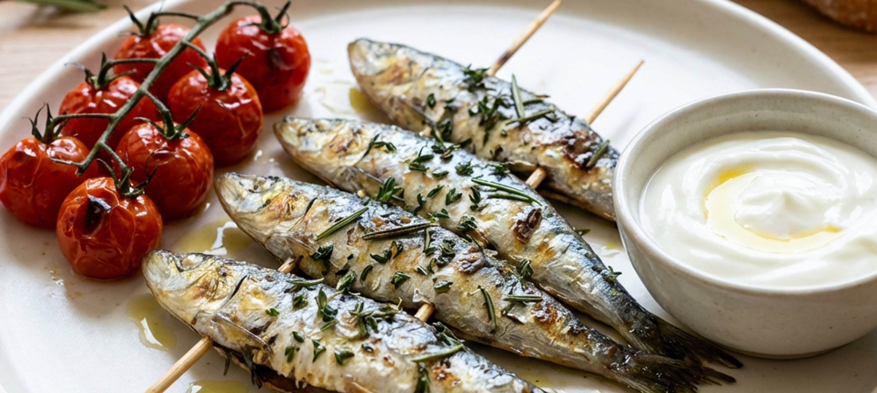 - 5Rozpálíme gril a sardinky z obou stran grilujeme. Menší kousky stačí minutu a půl, větší dvě minuty z každé strany. Na gril přidáme také cherry rajčata a plátky chleba zakápnutý olivovým olejem a opečeme.