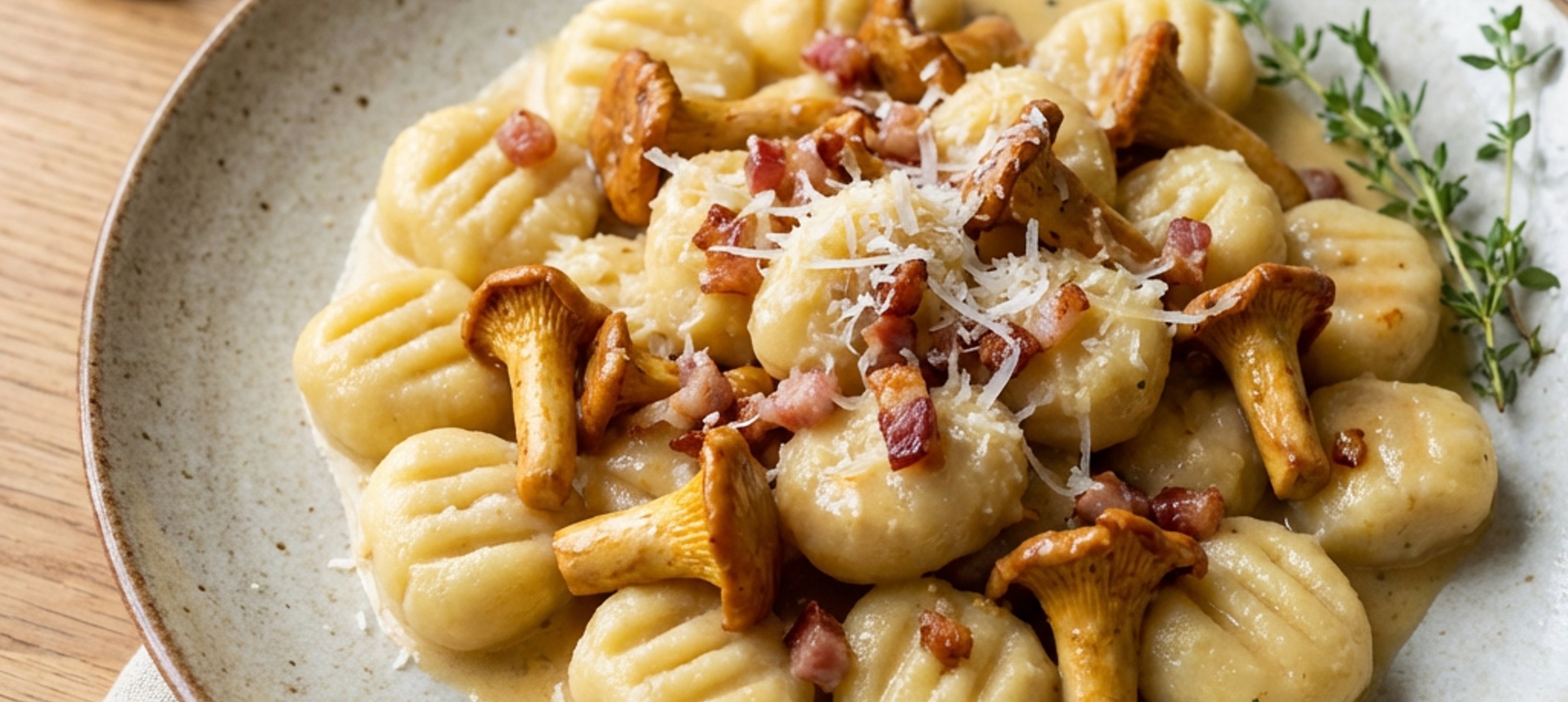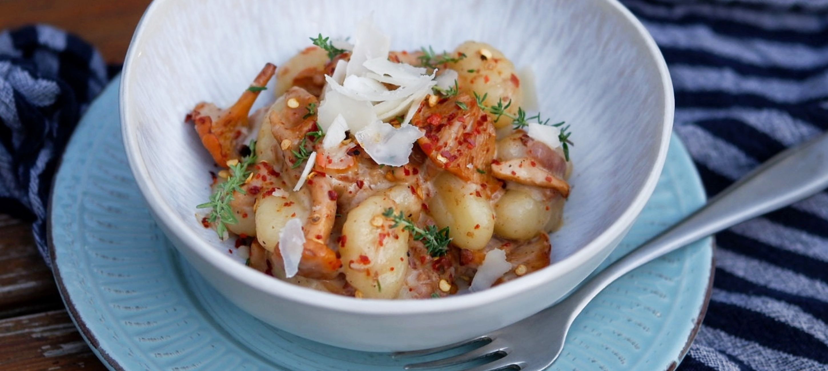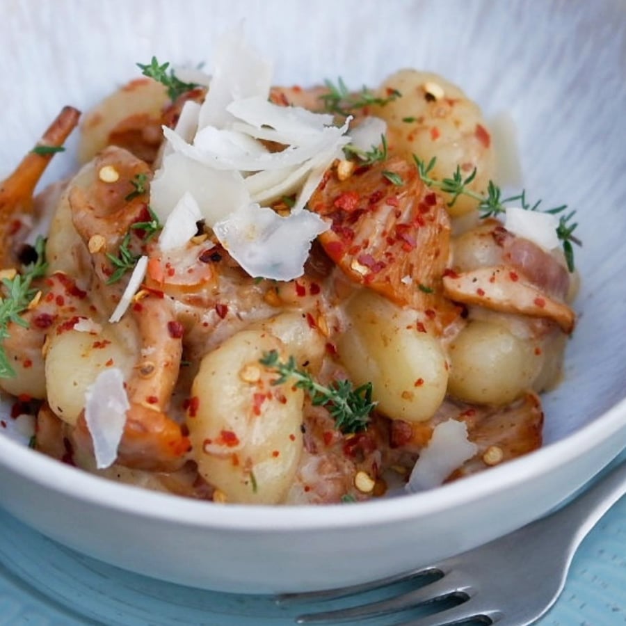 - 2Než se nám uvaří brambory, připravíme si omáčku. Na oleji orestujeme najemno nasekanou cibuli. Přidáme na plátky nakrájený česnek a necháme zezlátnout. Lišky nakrájíme na menší kusy, ty malé necháme vcelku. Přidáme na pánev společně se snítky tymiánu a zalijeme proseccem. Osolíme a společně dusíme cca 5 minut, dokud nebudou lišky měkké. Zmírníme plamen a přilijeme smetanu. Necháme zredukovat na polovinu. Dochutíme solí, pepřem, chilli a vmícháme polovinu pecorina nakrájeného najemno.