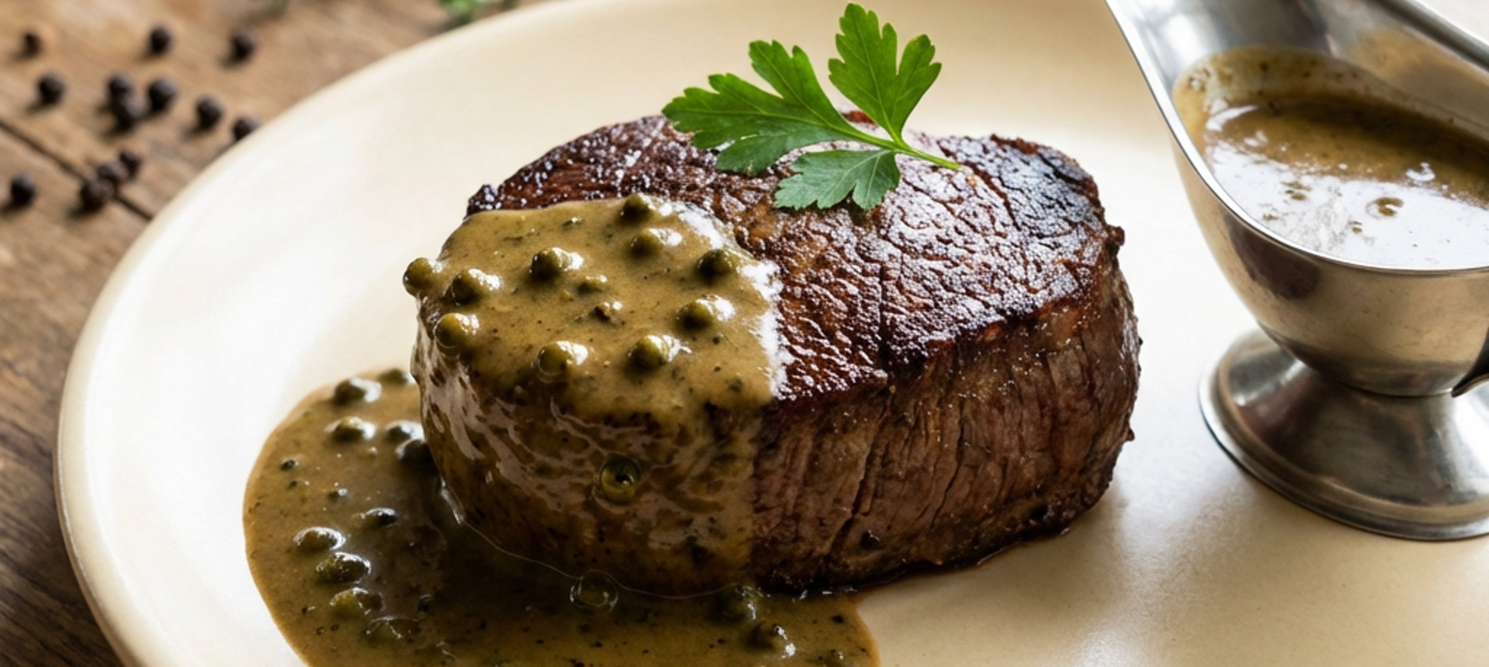 - 1V rendlíku na středním ohni nasucho orestujeme 2 minuty za stálého míchání zelený pepř. Přilijeme víno, stáhneme oheň a uvaříme pepř doměkka. Víno necháme z rendlíku zcela vyvařit. Stáhneme rendlík z plotny, přilijeme koňak, vrátíme rendlík zpět na sporák a koňak necháme zcela vyvařit.