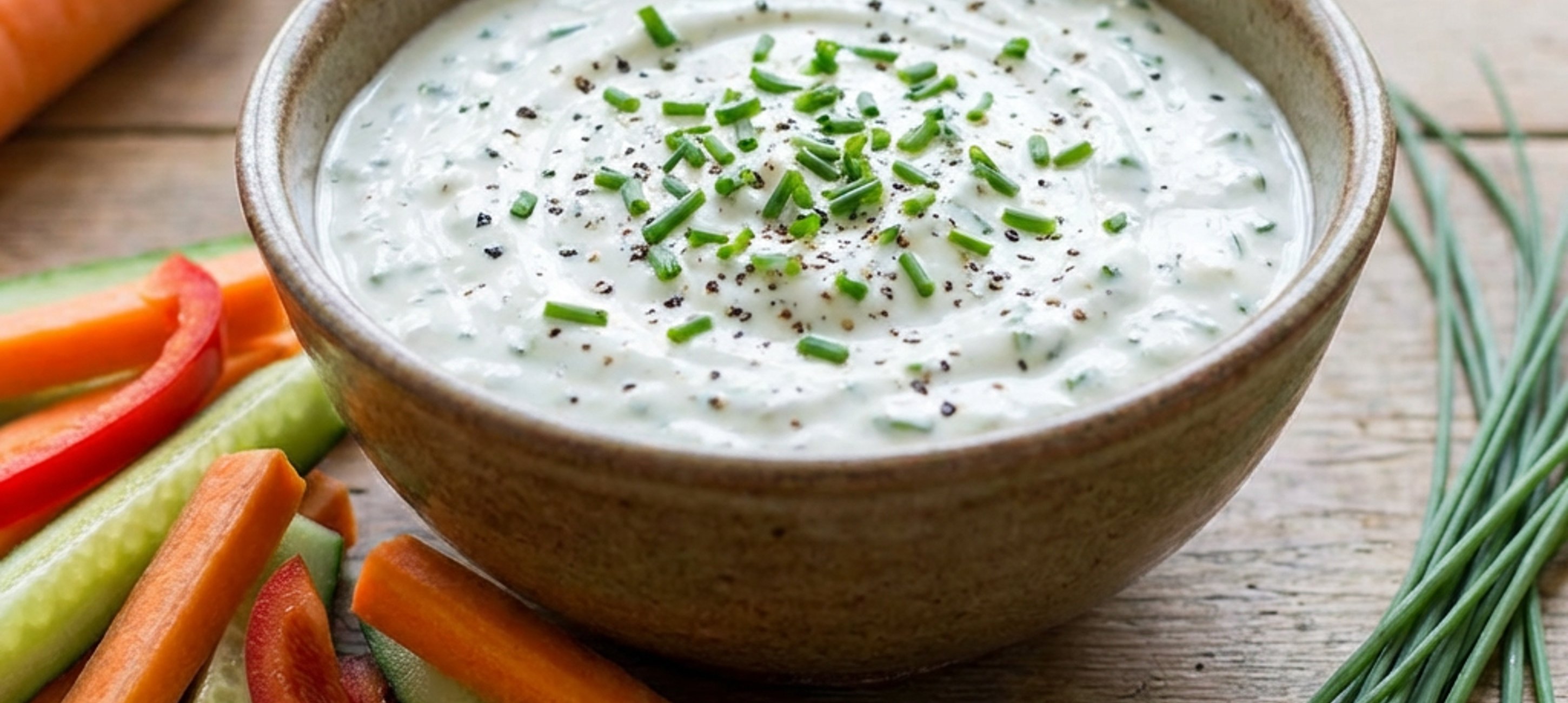 - 2Na dip smíchejte lučinu, nakrájenou pažitku a dochuťte solí a pepřem.