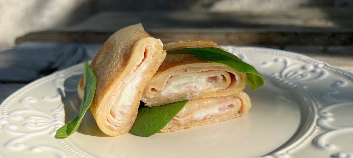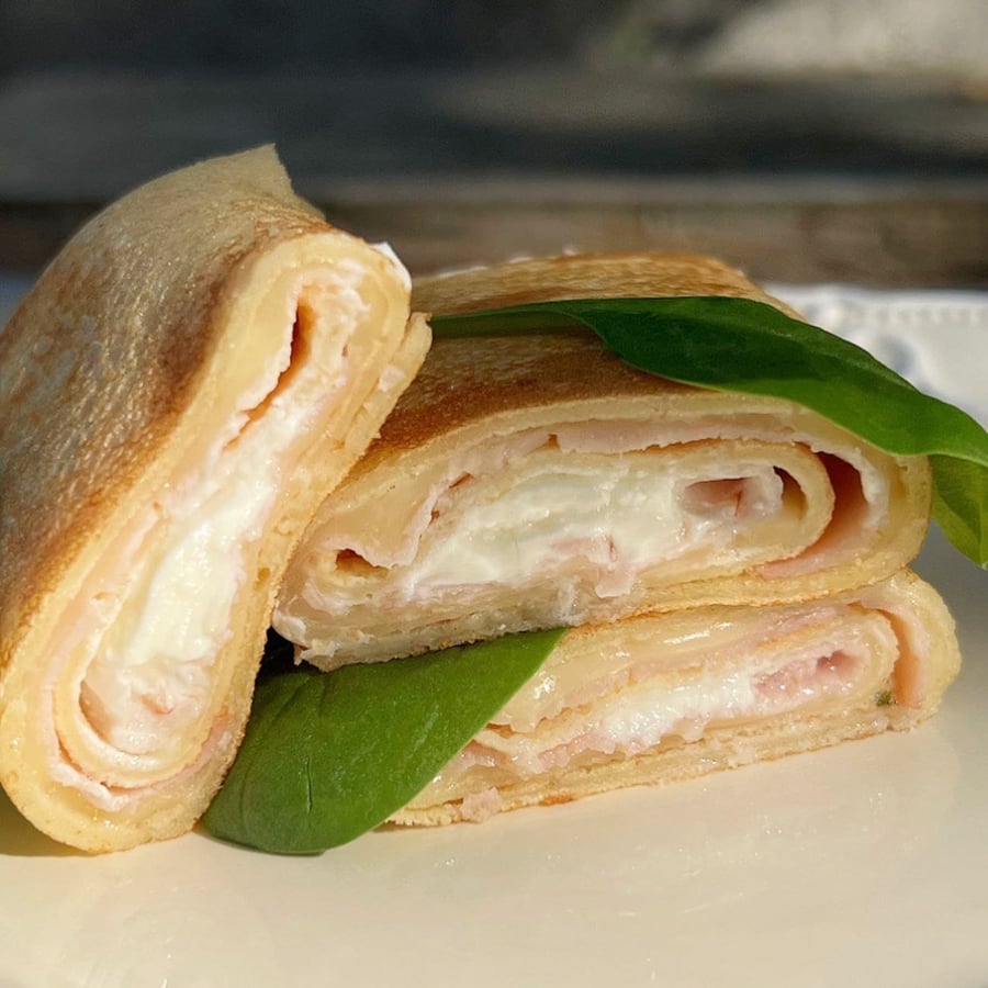 - 2Zarolujte ideálně jako jarní závitek, tedy začněte zahrnutím postranních částí a pak rolujte směrem od sebe. Krátce zapečte v sandvičovači nebo z obou stran na stejné pánvi. Můžete podávat i studené.