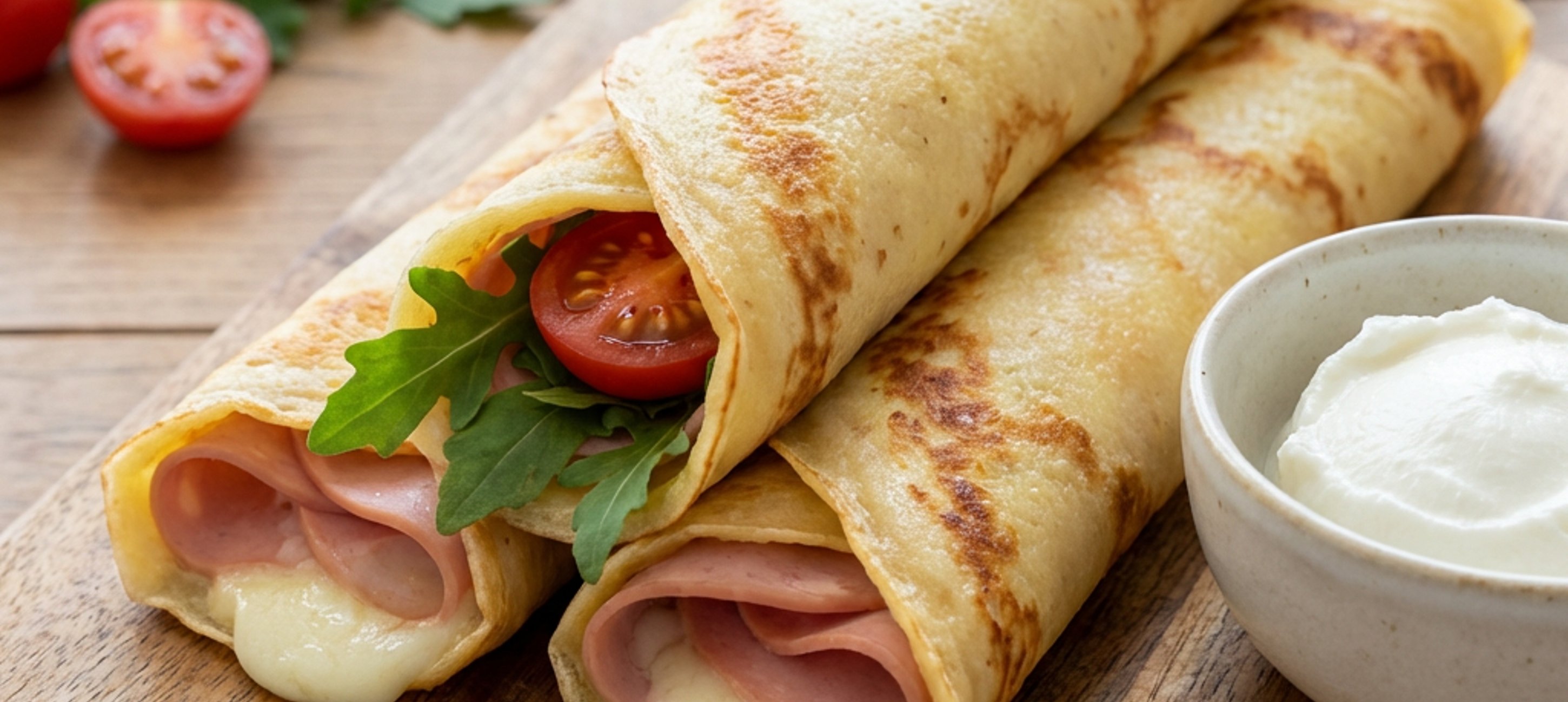 - 1Na vychladlou palačinku rozložte sýr (ne až ke koncům), na něj mortadellu a až navrch buď rajčata, rukolu nebo trochu čerstvého sýra. Obecně jsou kombinace na vás. Sýr musí jít první, aby při zapékání palačinku uzavřel a neměla tendenci se zpátky otevřít.