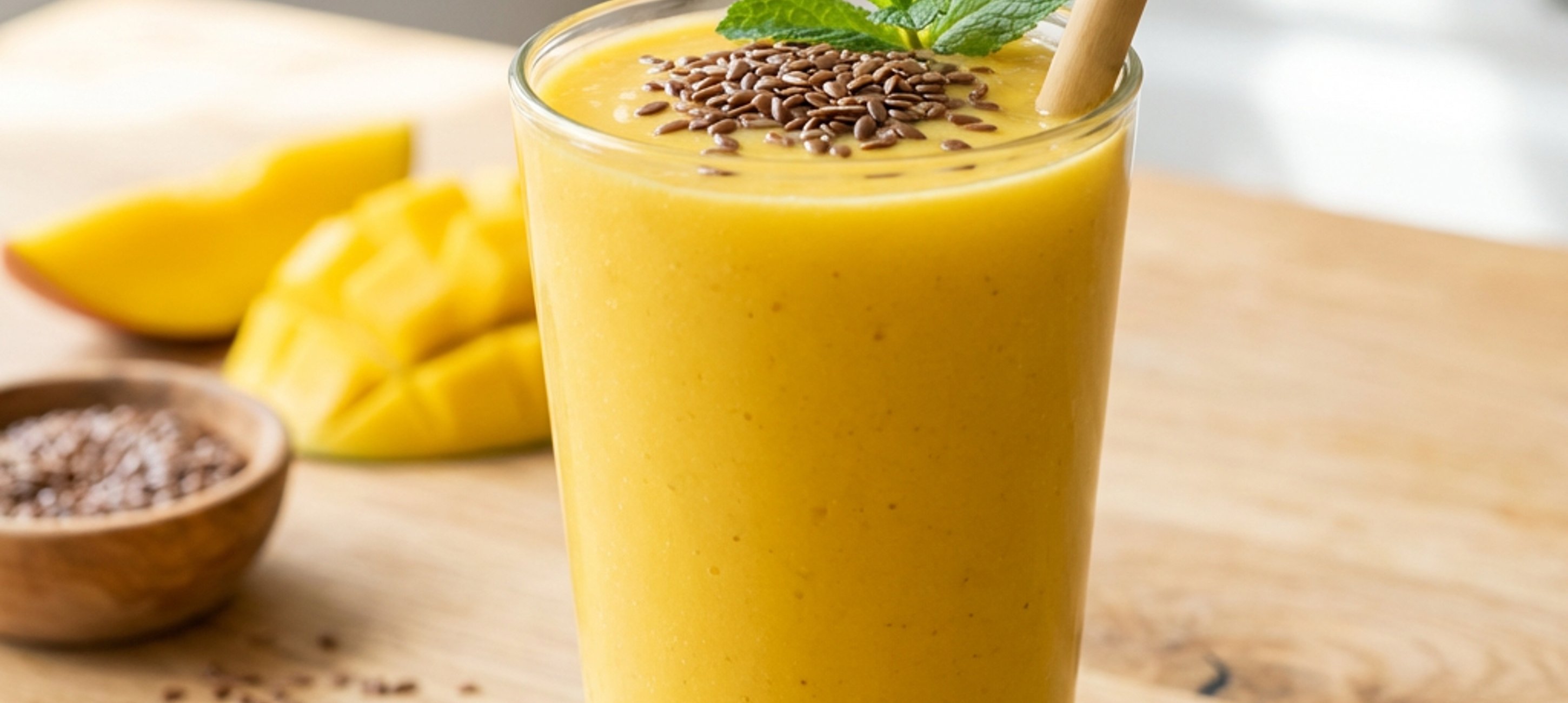 - 4Nalijte do sklenice, ozdobte lněným semínkem a mátou.