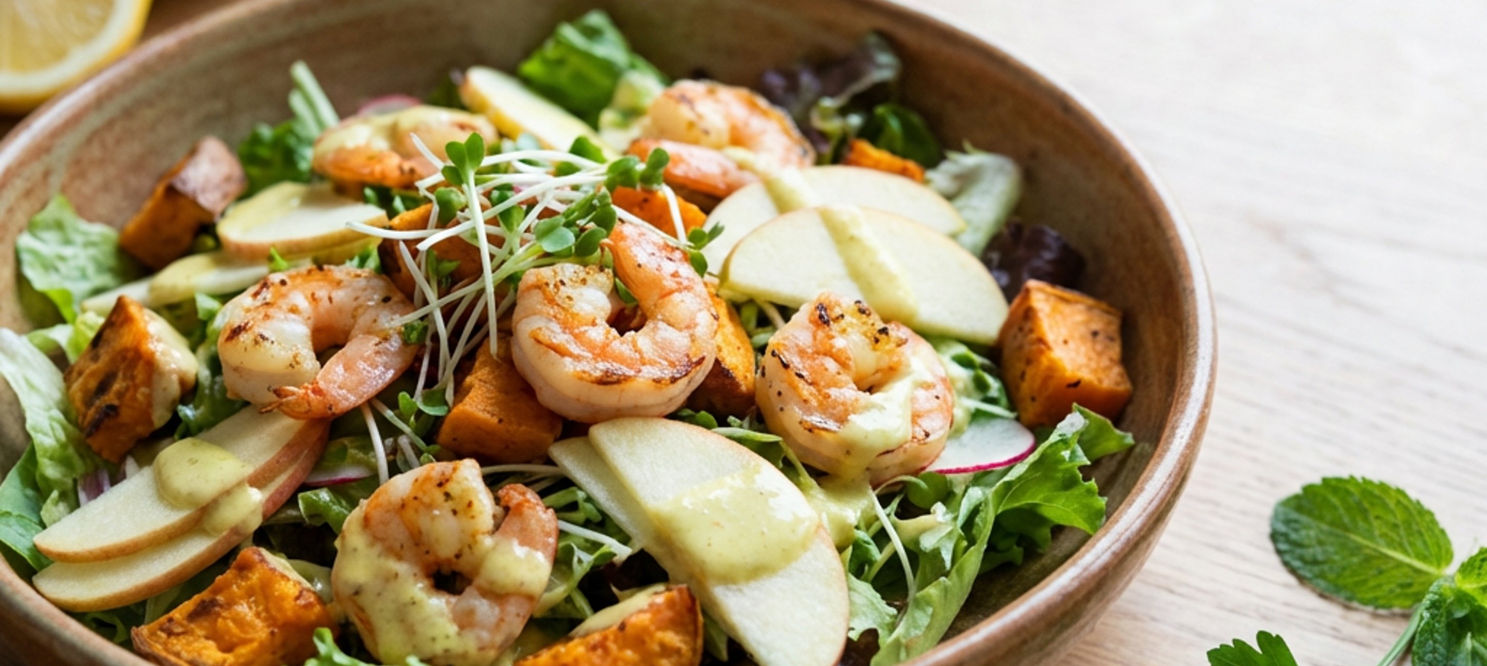 - 4Rozkrájejte jablka, zakápněte citronovou šťávou. Zamíchejte ve větší salátové míse listy salátů, nakrájené bylinky, batáty a jablka. Podávejte s kari dresinkem a grilovanými krevetami.