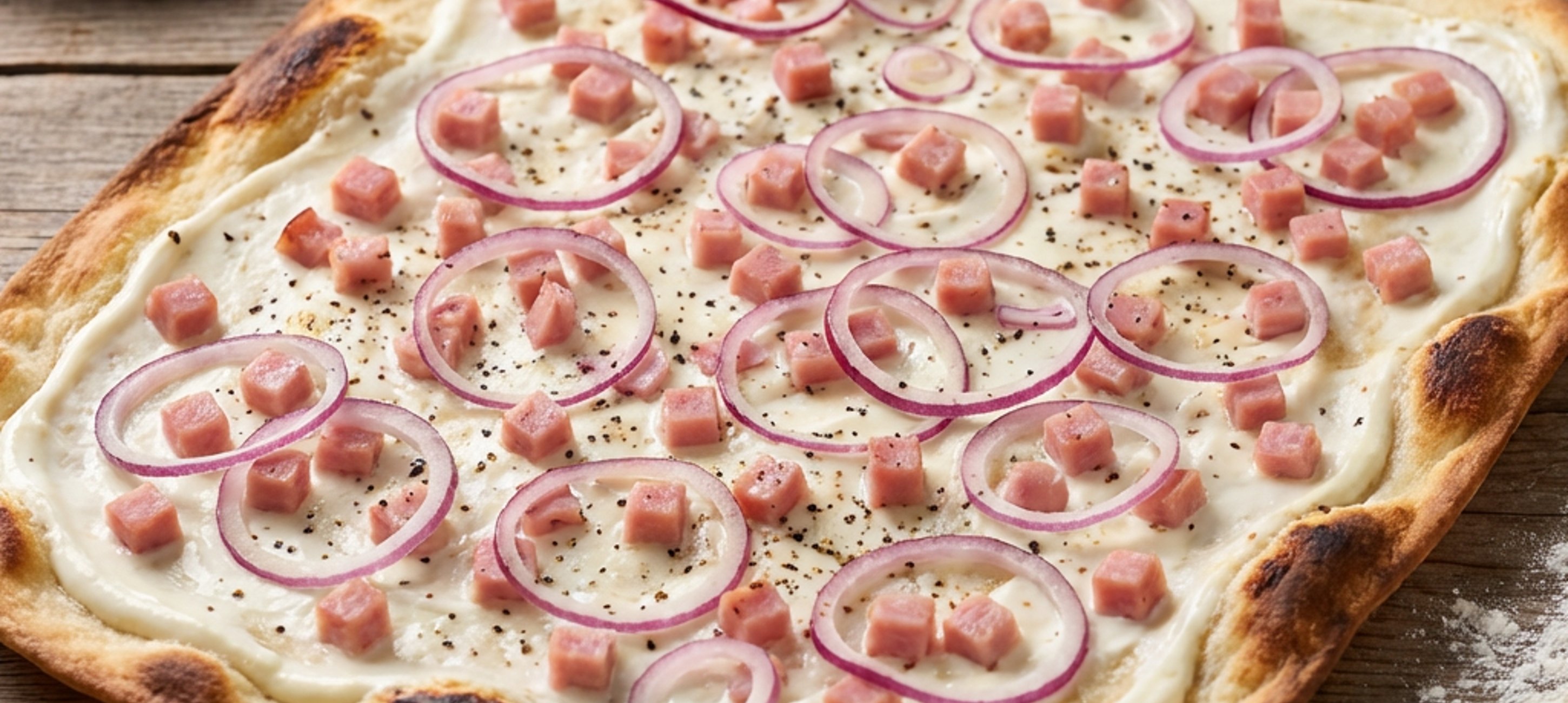 - 7Hotový Flammkuchen servírujte ihned. Na plech můžete hned dát další placku a celý proces opakovat. Dobrou chuť.
