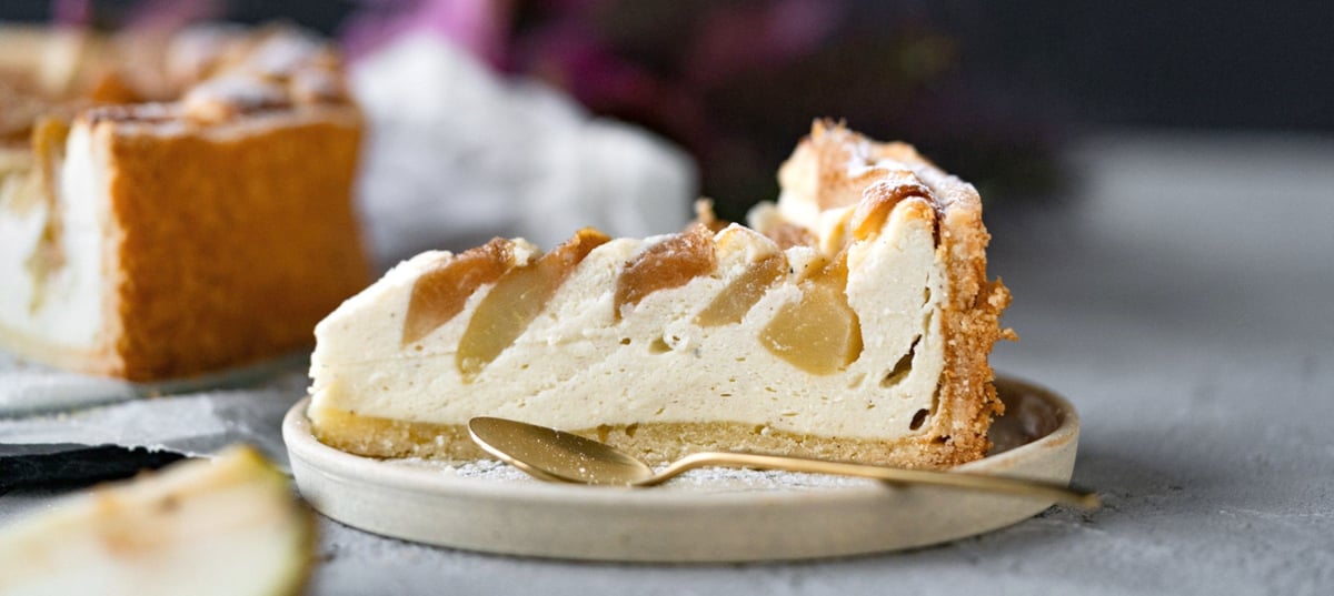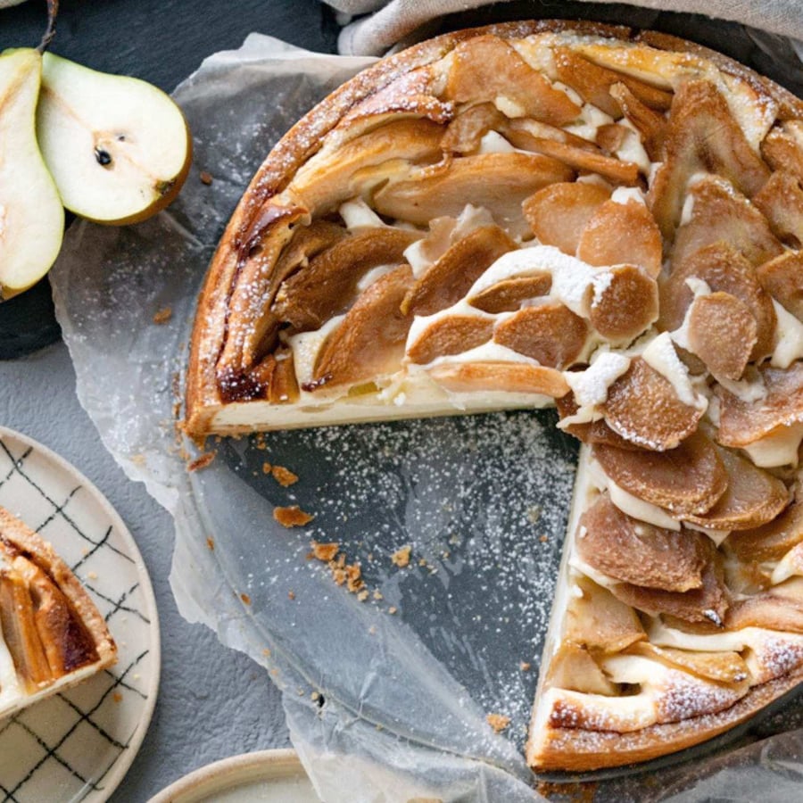 - 1Tvarohovou hmotu nalijte do připravené koláčové formy a plátky hrušek poklaďte povrch (částečně ponořte spodní hranu hruškového plátku do tvarohu) tak, abyste vždy od okraje formy ke středu pokládali jednu polovinu stejné hrušky.