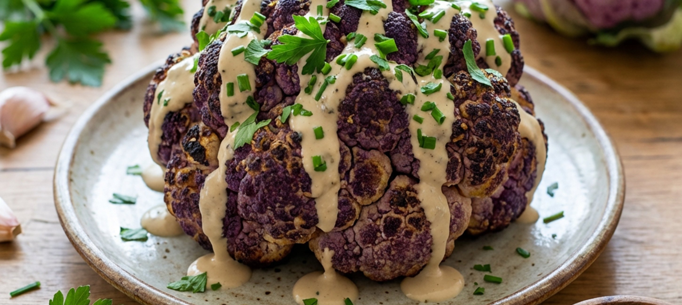 - 4Upečený květák podáváme posypaný čerstvými bylinkami a politý tahini zálivkou.