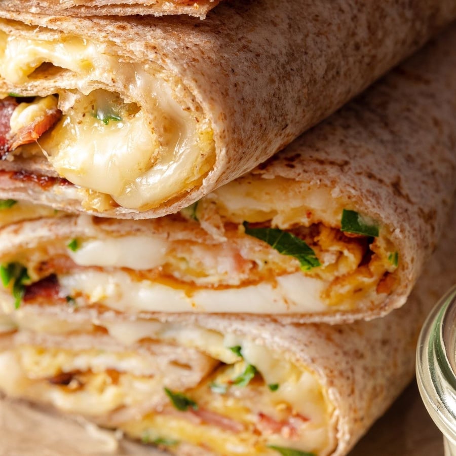 - 3Pour the eggs over the fried onion and bacon so that the mixture is the size of the tortilla, and without interfering, let the eggs sit on the pan for about 10–20 seconds on low heat. Cover the half-cooked eggs with the tortilla and let them stick (another 10 seconds). Then carefully flip the tortilla down onto the pan and sprinkle the top (egg part) with cheese. Once the cheese is melted, roll up the tortilla and serve warm.