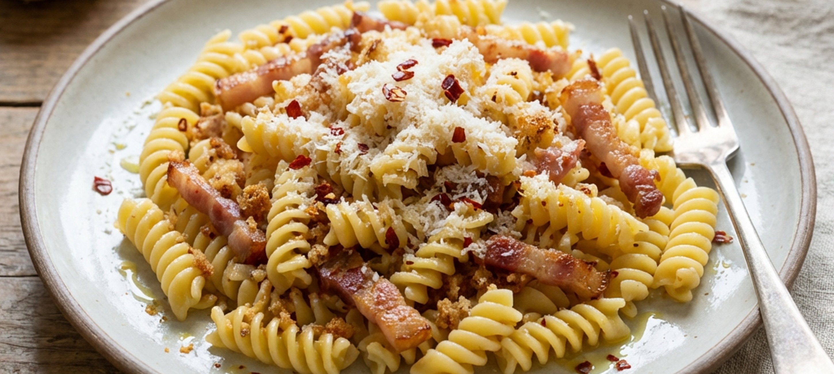 - 1Na pánvi rozehřejeme olivový olej s celým stroužkem česneku. Po chvíli až olej zavoní, česnek vyjmeme. Přidáme nahrubo drcené sušené papričky, strouhanku a pancettu nakrájenou na jemné proužky. Chvilku restujeme tak, aby se chutě propojily.
