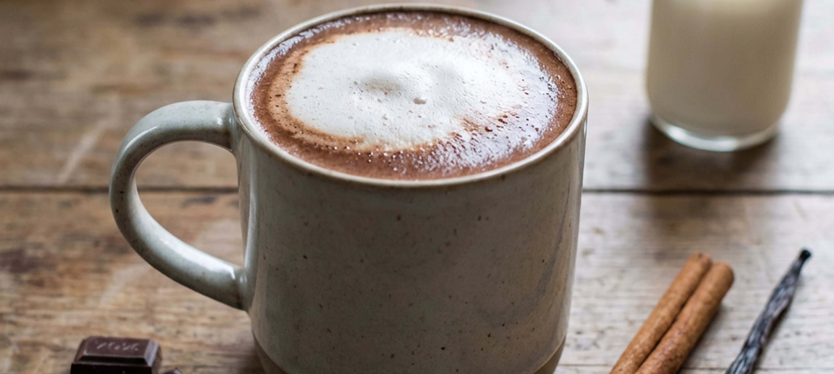 - 2Po 25 minutách vytáhneme koření a mléko opět zahřejeme, přidáme kakao, vanilku, špetku soli a cukr, rozmícháme metličkou a rozmixujeme tyčovým mixérem do hladka, abychom dosáhli větší nadýchanosti čokolády.