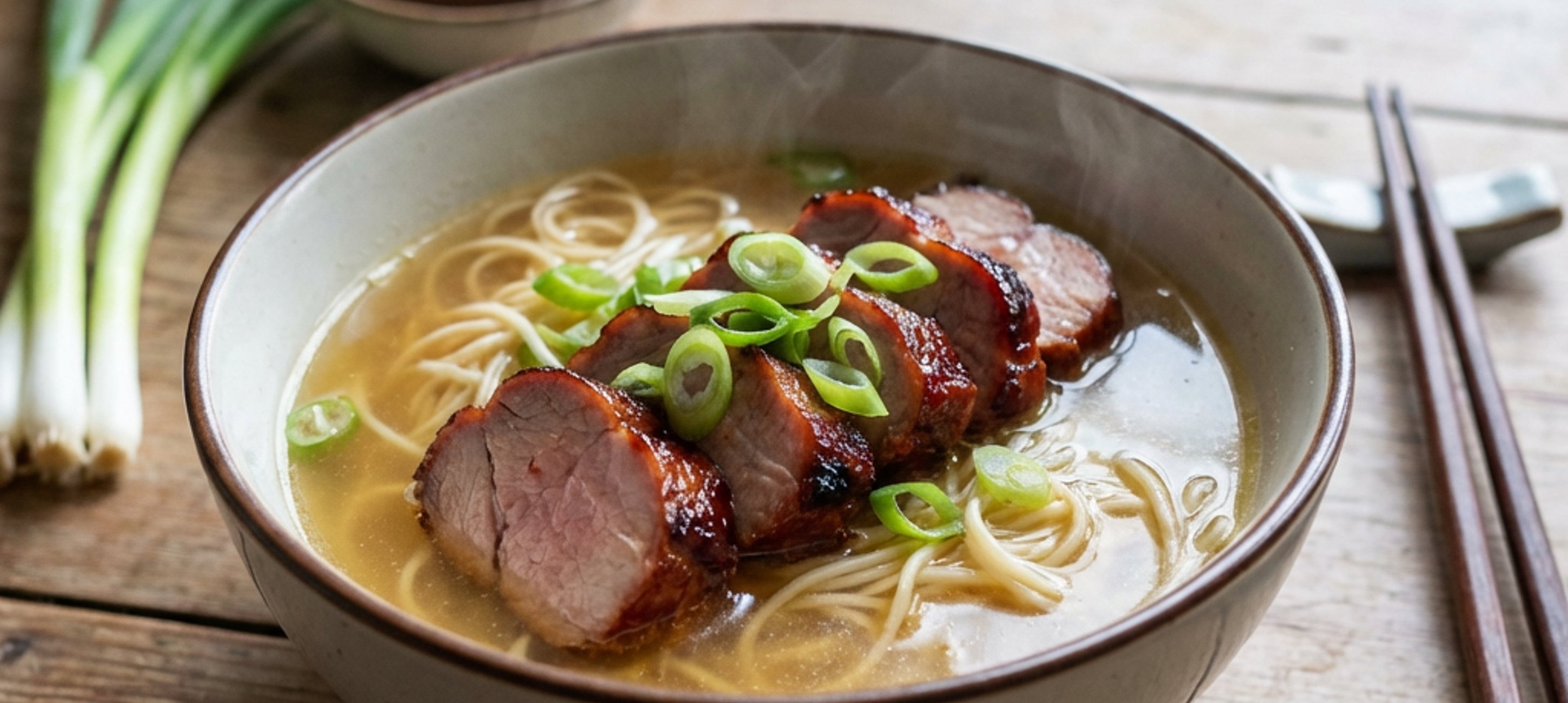 Maso nakrájené na plátky položte do nudlové polévky (z kuřecího vývaru) a posypte trochou jarní cibulky. Tím vznikne známá nudlová polévka Char Siu.