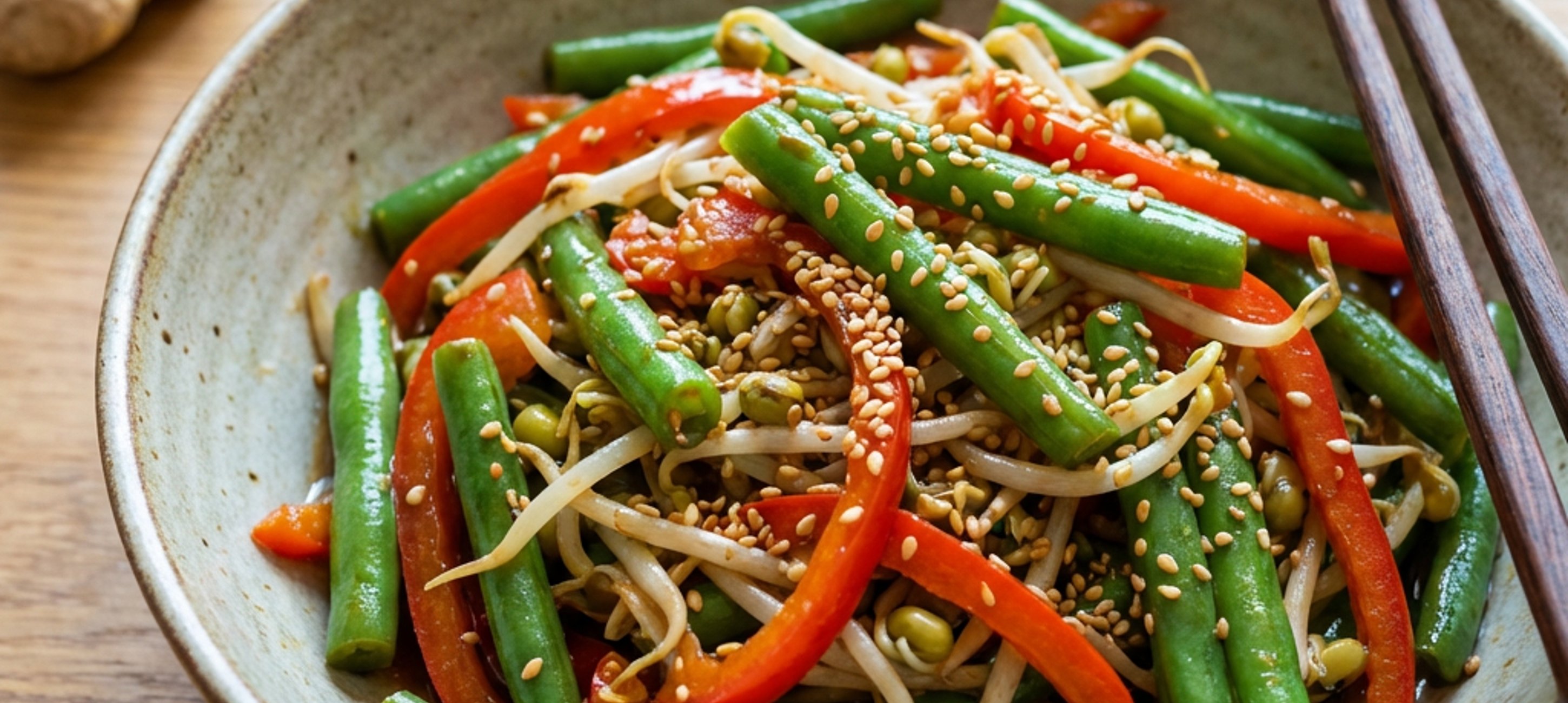 - 2V horkém oleji osmahněte česnek a zázvor. Přidejte fazolky a smažte, dokud nebudou téměř hotové. Pak přidejte klíčky a červenou papriku a restujte další 2 minuty.