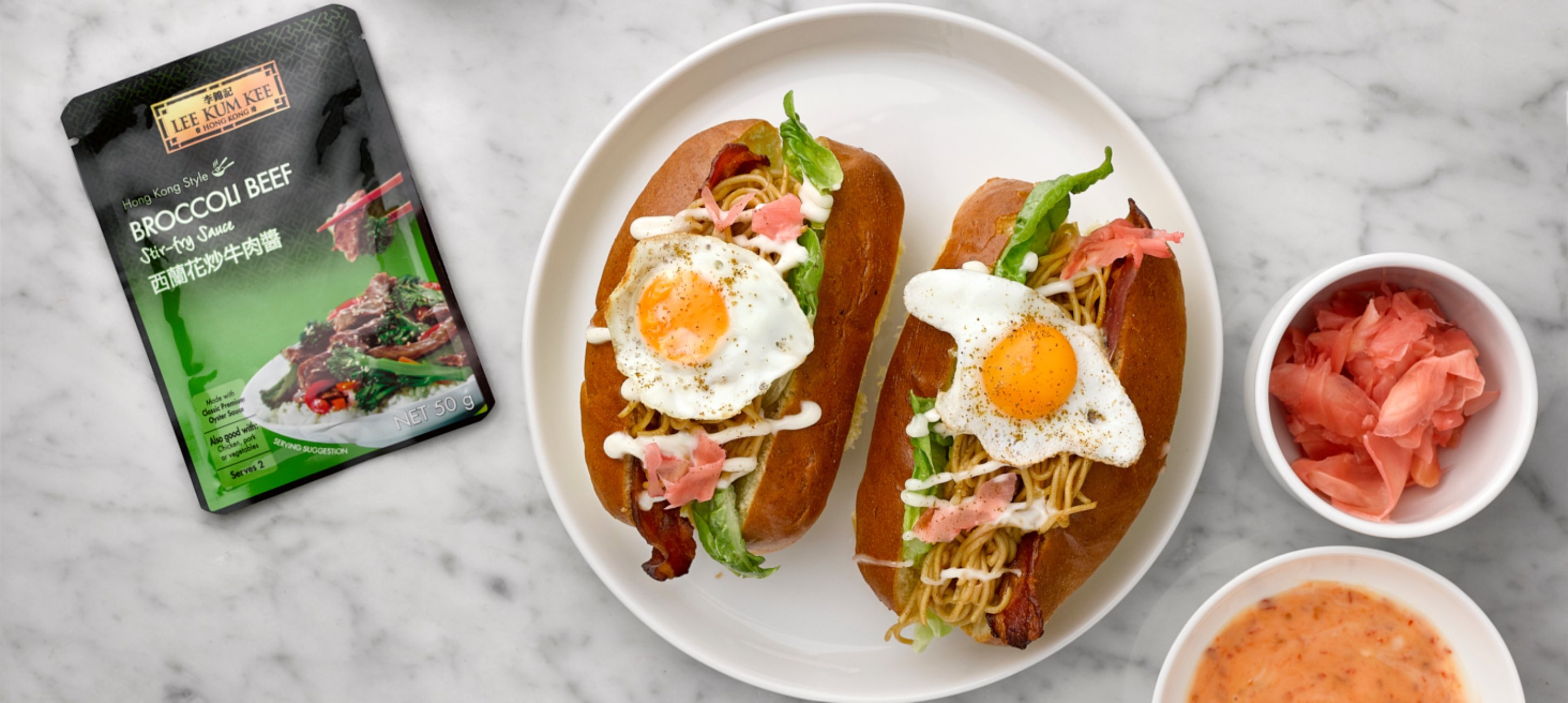 - 4Stir-fry the egg noodles with Lee Kum Kee Stir-Fry Sauce for Hong Kong Style Noodles. Add lime juice. Crush one piece of crispy bacon and mix it into the noodles.