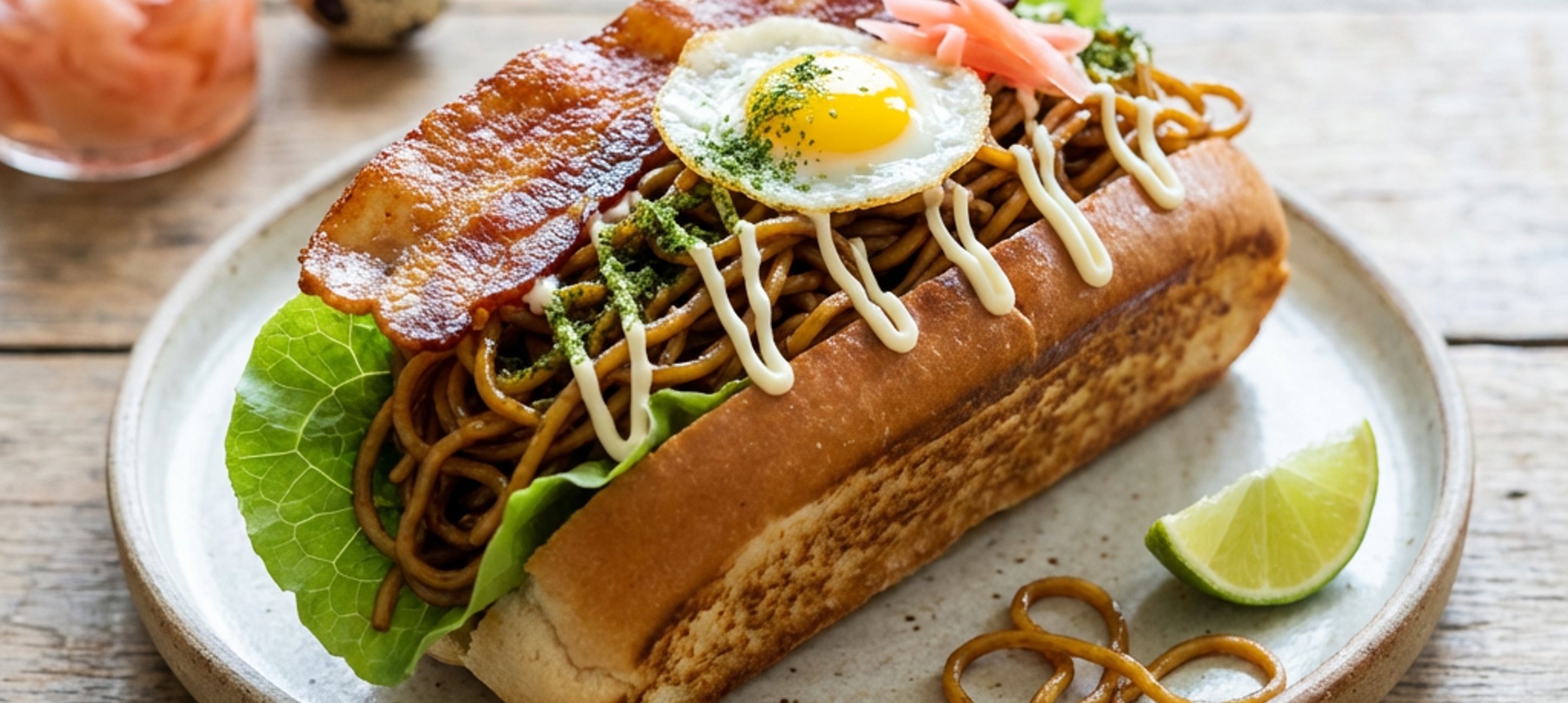 - 7Housku na hotdog opatrně rozevřete k naplnění. Nejprve do ní uložte nudle. Dále ji obložte listem hlávkového salátu a křupavou slaninou. Dochuťte majonézou, na každou půlku uložte vejce, posypte práškem z mořských řas a ozdobte nakládaným zázvorem.