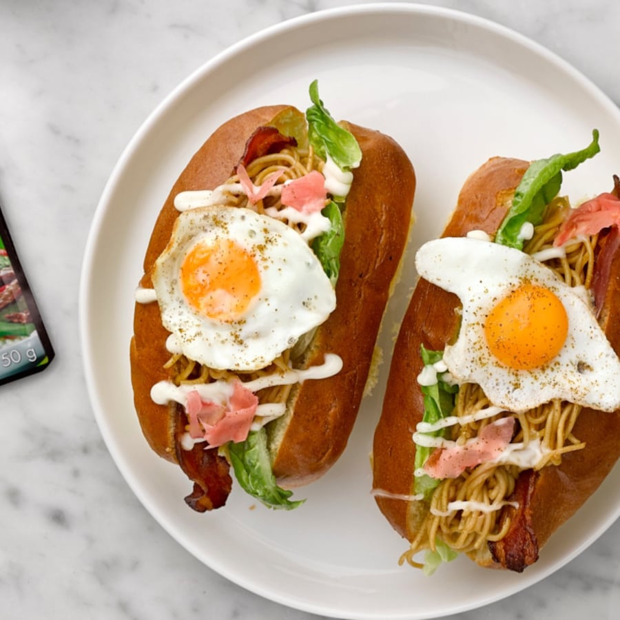 - 7Carefully open the hot dog bun for filling. First, place the noodles inside. Then top with a leaf of lettuce and crispy bacon. Season with mayonnaise, place an egg on each half, sprinkle with seaweed powder, and garnish with pickled ginger.