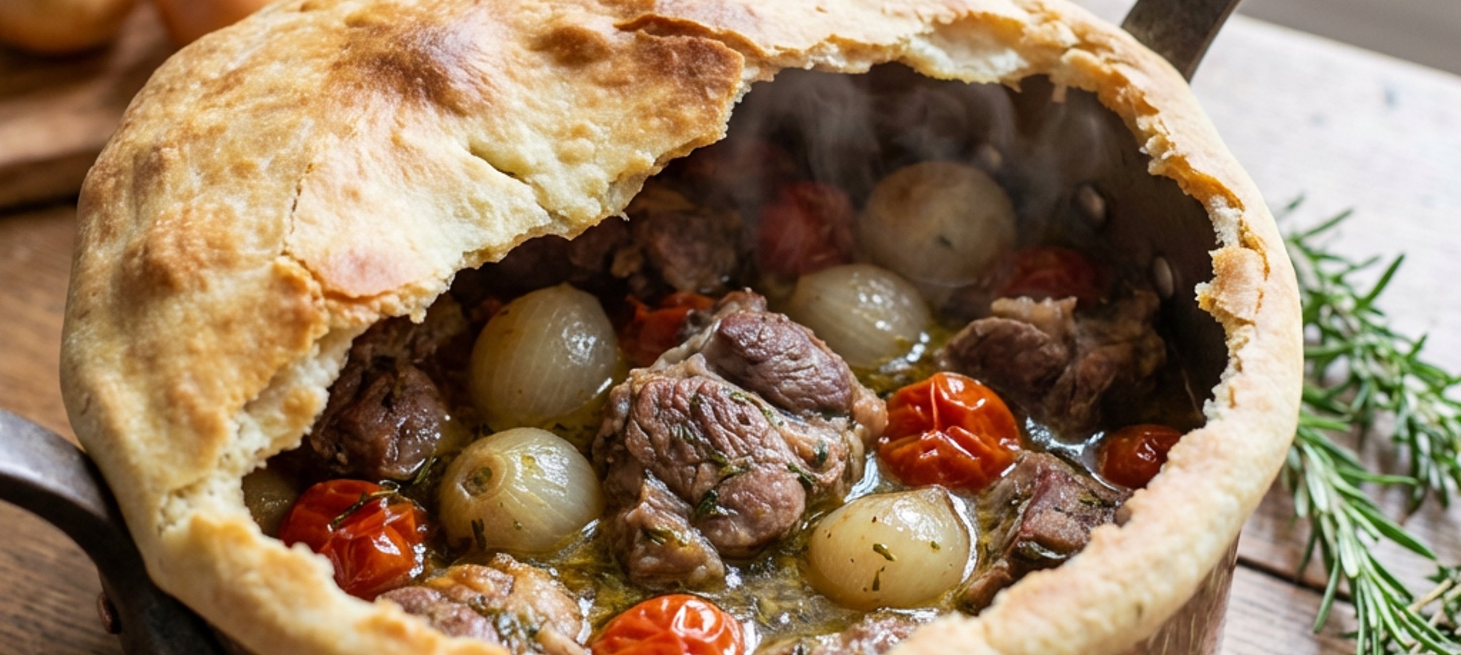 - 5Vyjmeme z trouby a poklici vyměníme za tenký plát těsta na klasický italský bílý chléb, který po stranách k hrnci přimáčkneme, aby přilnul. Dopečeme ještě 15 minut a pokrm je hotov.