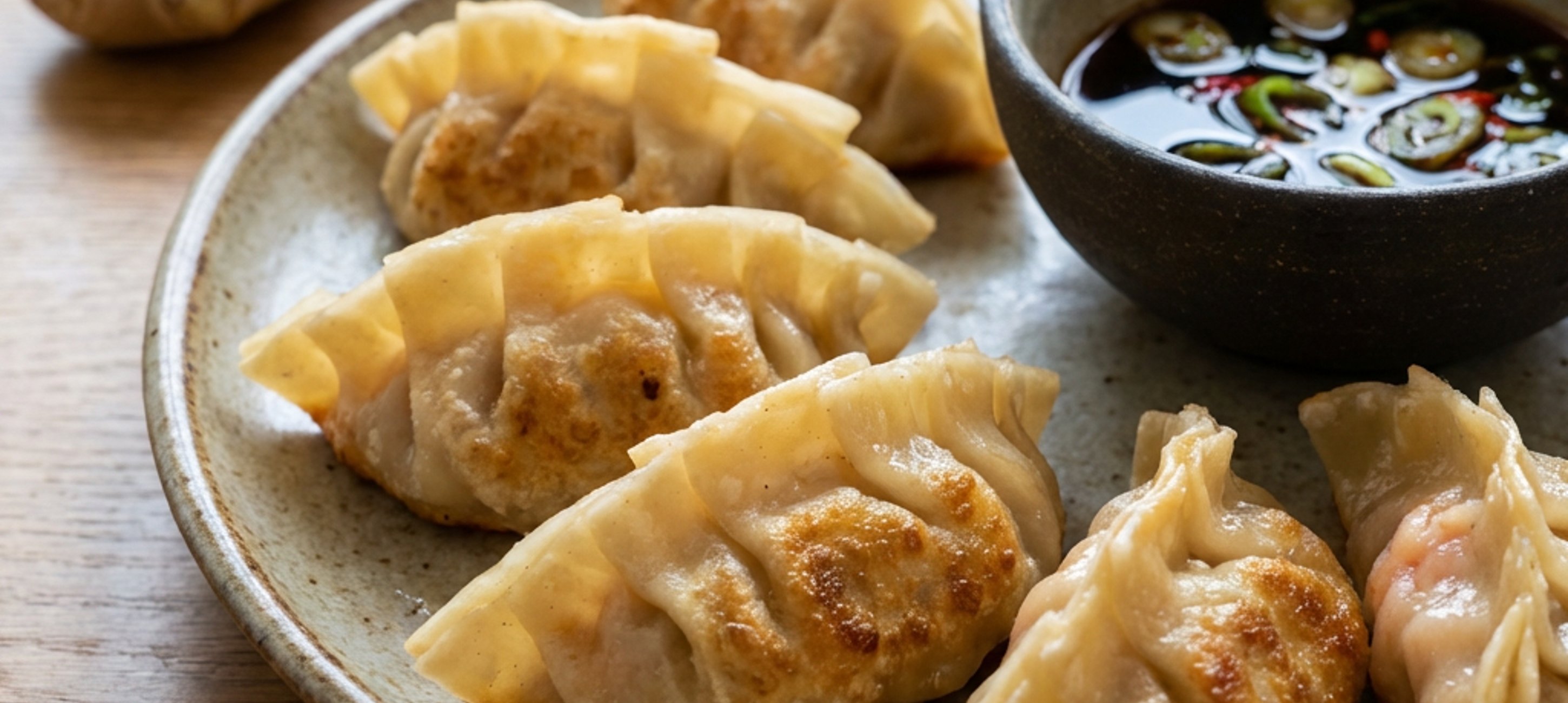 - 4Těsto rozválíme na tloušťku 1 mm. Vykrájíme kolečka o průměru 8 cm. Pokud nemáme vykrajovátko, postačí nám sklenice, či hrnek. Naplníme krevetovou směsí, kolečko přiklopíme a prsty vymačkáme okraje. Orestuje dozlatova ze všech stran na pánvi s nepřilnavým povrchem. Poté podlijeme vodou, přiklopíme poklicí a necháme 5 minut v páře dusit.