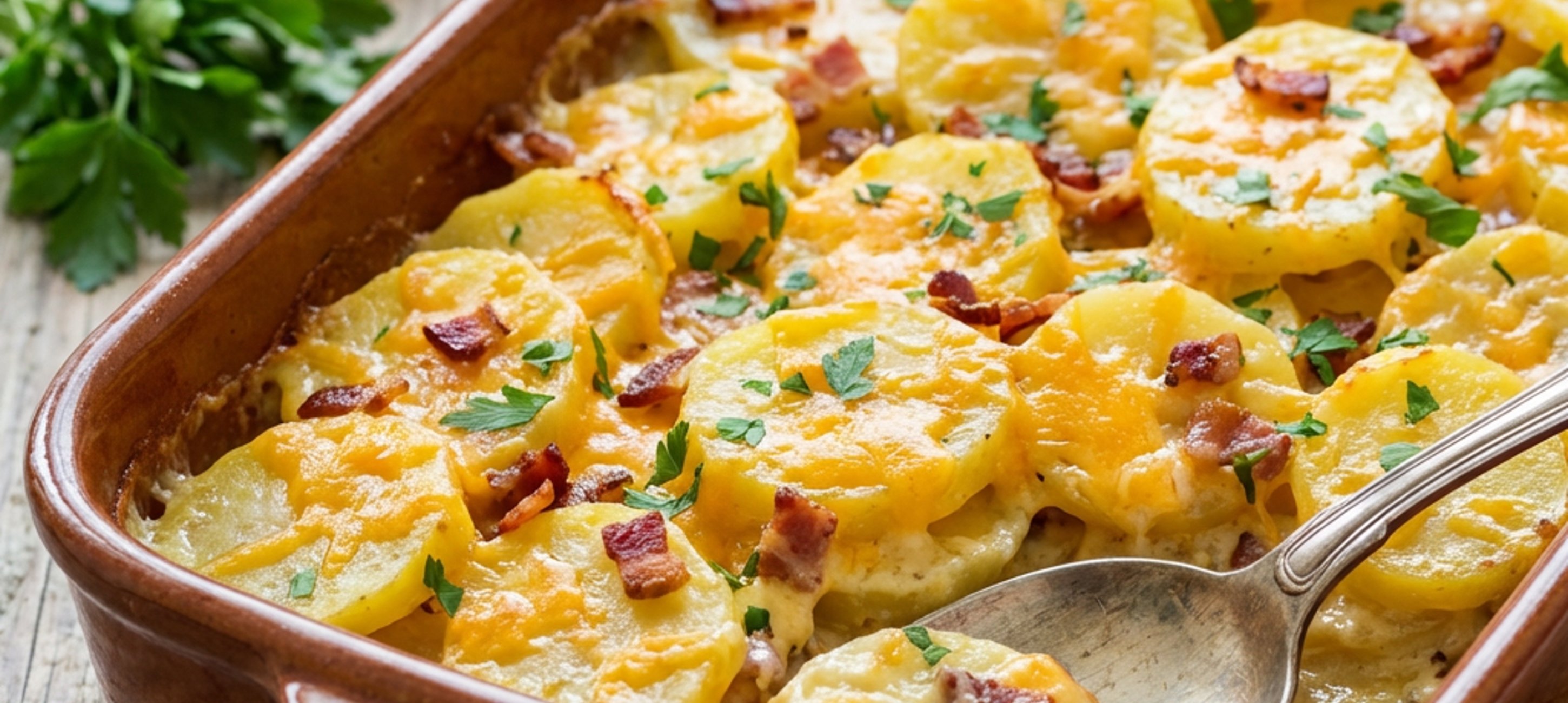 - 4Uvařené brambory přeneste děravou lžící do zapékací formy tak, aby v hrnci zbylo alespoň 200 ml směsi smetany a mléka. Do této zbylé směsi nasypte eidam a čedar a na mírném plameni je nechte rozpustit (1–2 minuty). Dochuťte solí a pepřem, následně hrnec stáhněte z plamene a přimíchejte petrželovou nať. Směs nalijte na brambory a pečte 40–45 minut při 180–190 °C.