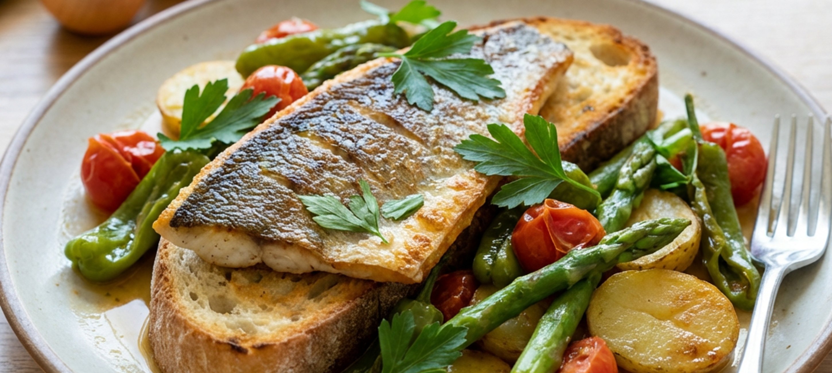 - 7Nasucho z obou stran opečený bílý italský chléb servírujeme rybu a následně obložíme a ozdobíme zeleninou i se šťávou z pánve.
