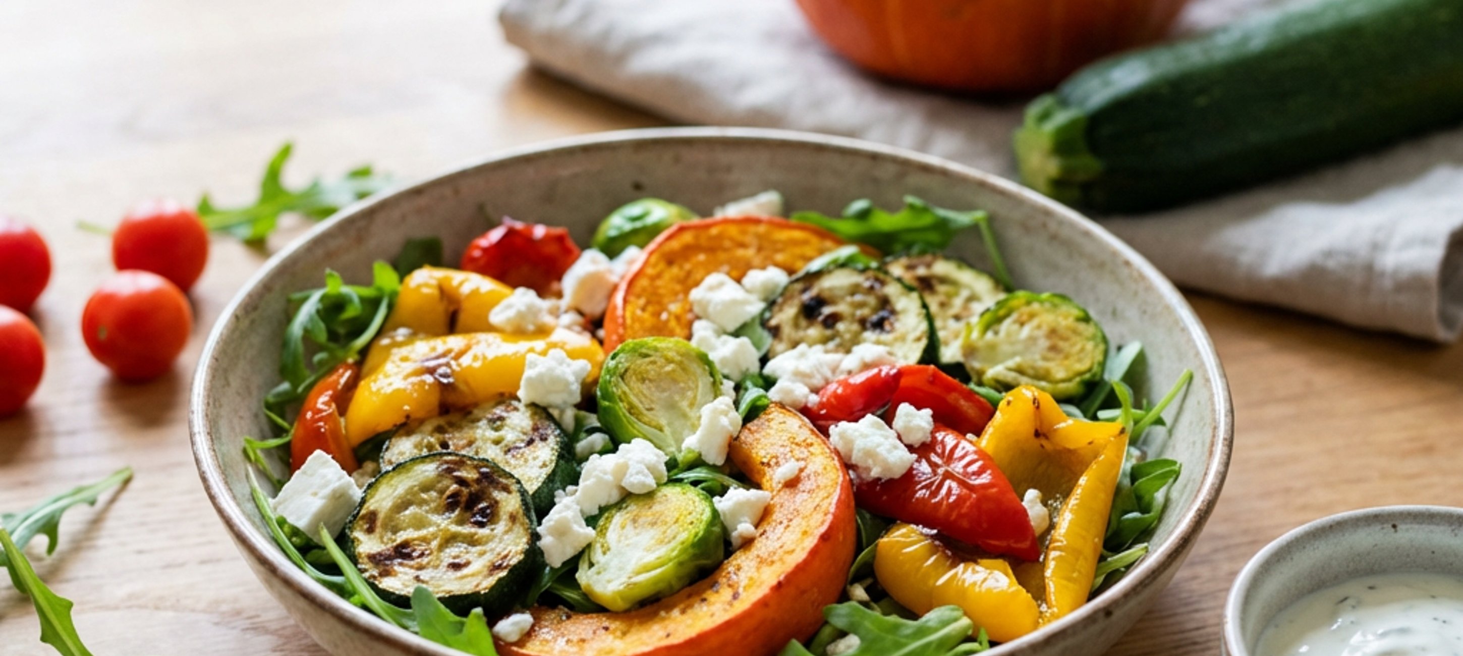 - 3Upečenou zeleninu smícháme s rukolou a nadrobeným feta sýrem. Podáváme s dipem připraveným ze zakysané smetany, sušeného česneku a soli a mletého pepře.