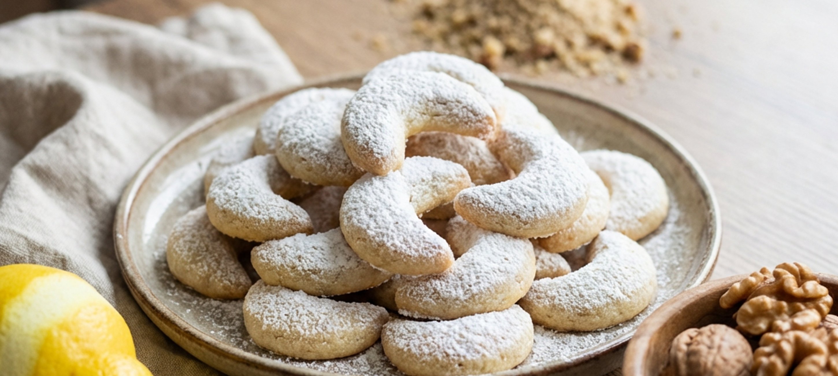 - 1V míse smícháme prosetou mouku a moučkový cukr. Přidáme změklé máslo, citronovou kůru a mleté vlašské ořechy a vypracujeme těsto. To následně zabalíme do fólie a necháme jeden až dva dny odležet.