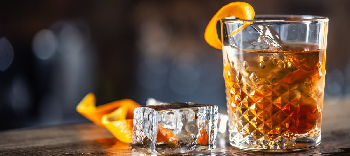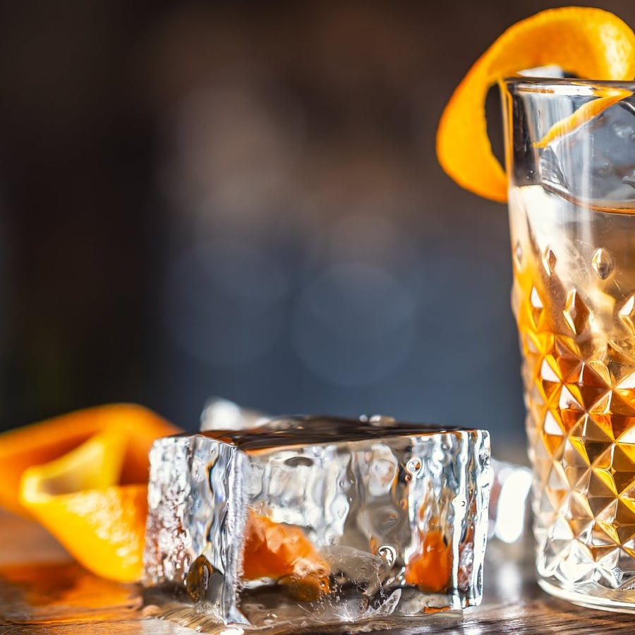 In the original recipe, the orange and sugar are replaced with a few drops of Angostura bitters.