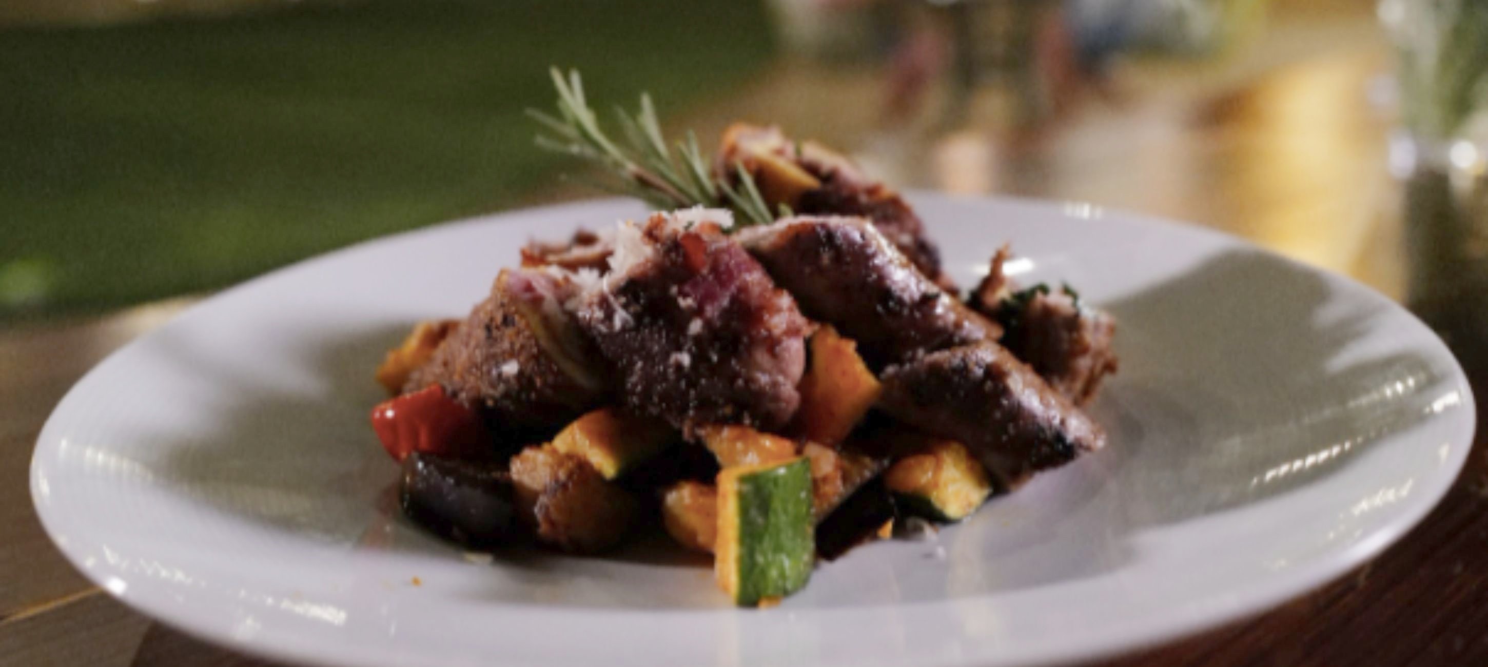 - 2Prepare the pork slices from the neck in the same way, layering them with slices of pancetta, grated Provolone cheese, and dust with breadcrumbs before rolling.