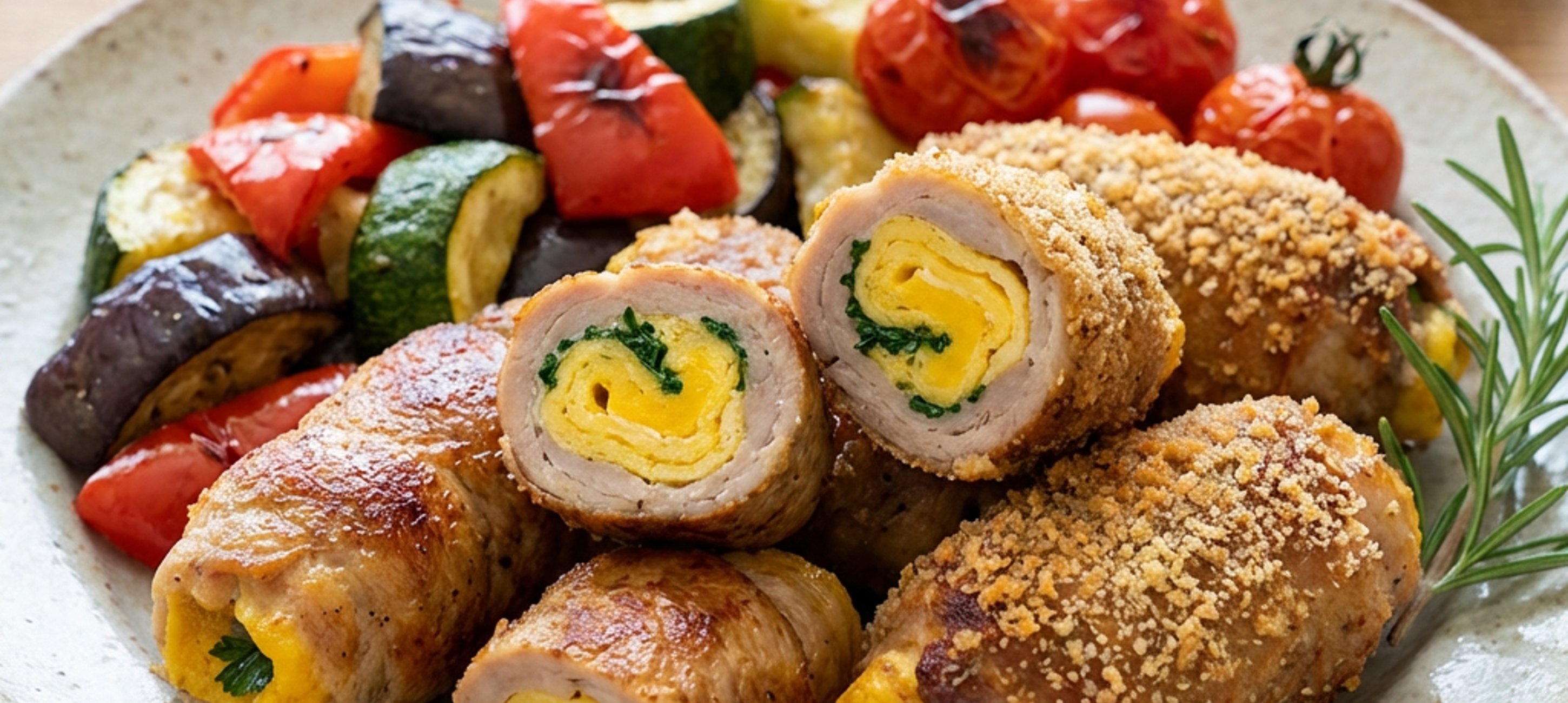 - 2Stejným způsobem, připravíme vepřové plátky z krkovice, které poklademe plátky pancetty, strouhaným sýrem Provolone, a před zabalením zaprášíme strouhankou.