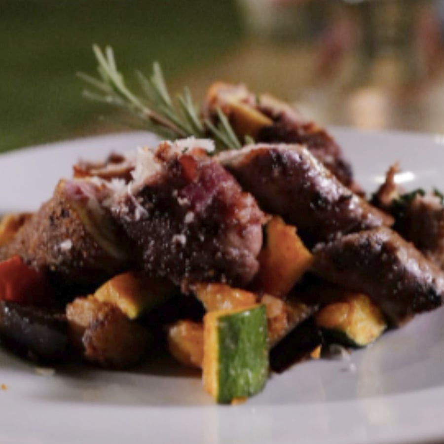 - 4Crush the potatoes with the skin on, cutting larger pieces. Cut the zucchini, bell pepper, and eggplant into larger cubes, halve the cherry tomatoes, and sauté everything together with the potatoes, fresh rosemary, a whole clove of garlic, and a sprig of parsley in olive oil until softened to taste.