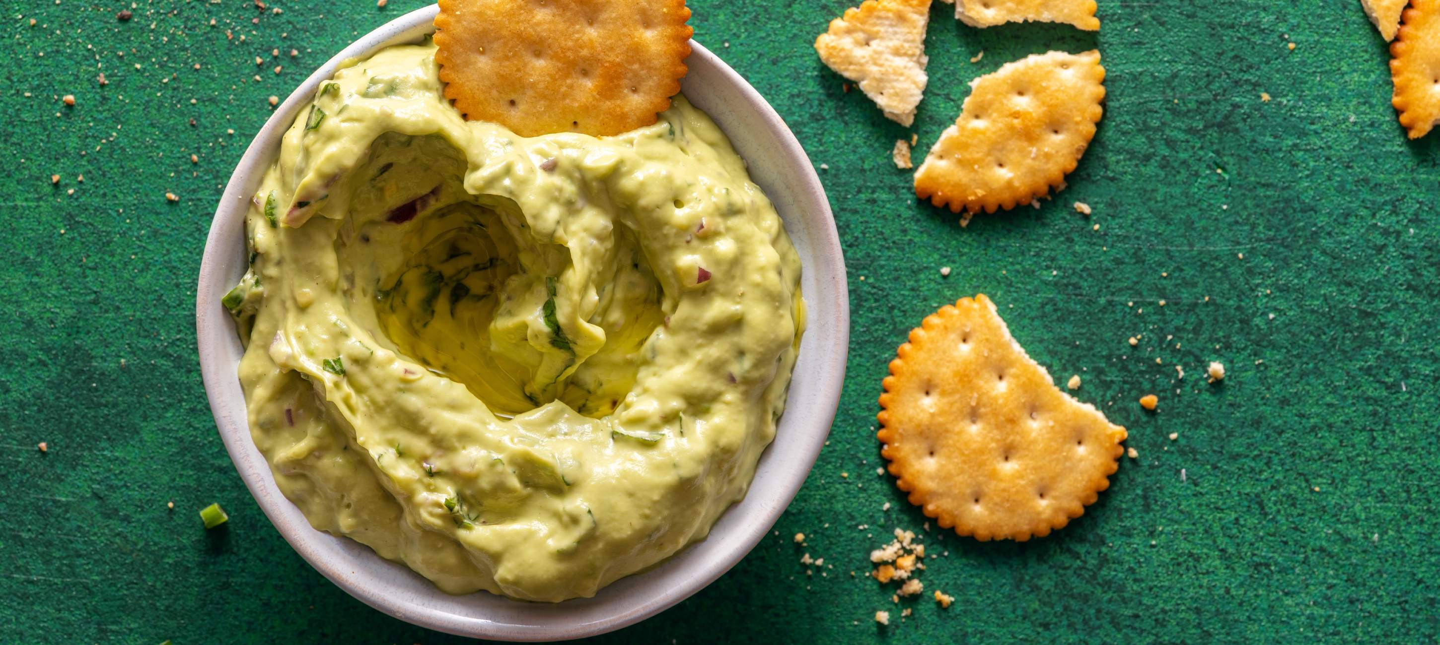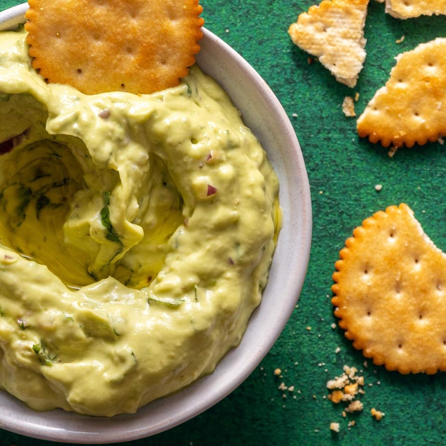 - 1Remove the skin and pit from the avocados and place them in a tall container. Add mayonnaise and blend with a hand blender until smooth.